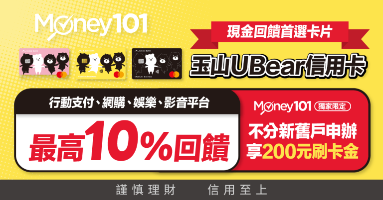 活動內容:不分新舊戶,透過Money101專屬連結首次申辦玉山U Bear信用卡正卡,核卡後30天內新增一般消費滿999元贈200元刷卡金。