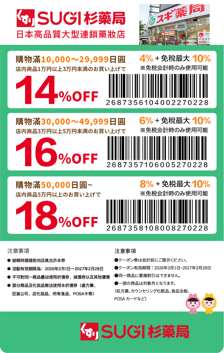 【日本藥妝店】SUGI藥局 (スギ薬局)-優惠券下載/COUPON/最高4%~8%折扣 (SUGI藥妝店、杉藥局)