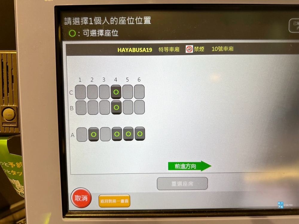 甚至您在出發幾十分鐘前都還來得及劃位,劃位時也可以注意A是單人座位、BC是雙人座位。如果您是一個人搭乘,不想跟其他人坐的話,記得要劃A座席喔!