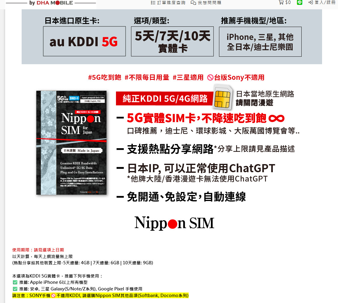 如果您有特別5G高網速+高流量的需求,可以試試看NIPPON SIM這張AU KDDI的頂卡,5G原生高速卡