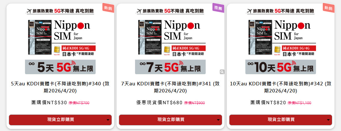 1.KDDI 5G 原生卡 5/7/10日卡 真吃到飽不降速,效期到2026/4/20