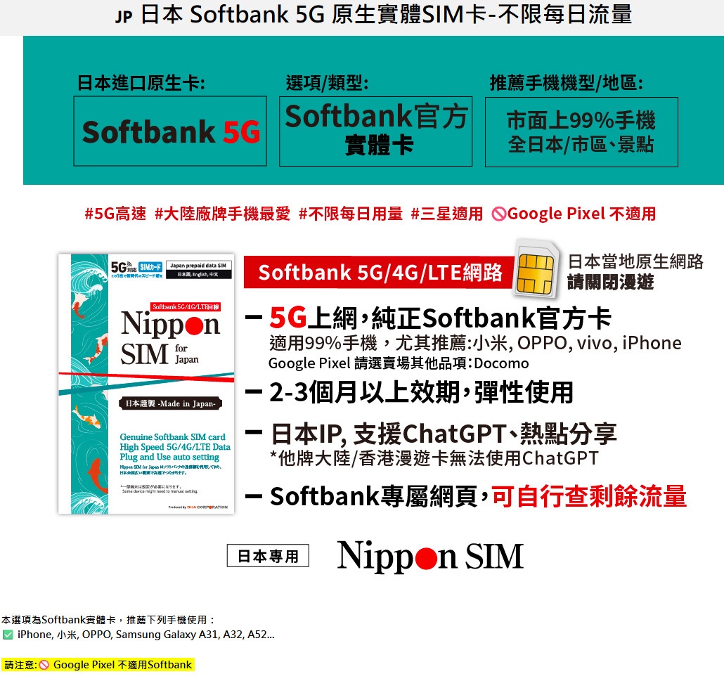 | Nippon SIM | Softbank原生卡(長效期、定量型) au KDDI 5G原生卡/eSIM(吃到飽不降速) | 請至蝦皮官方賣場訂購 |