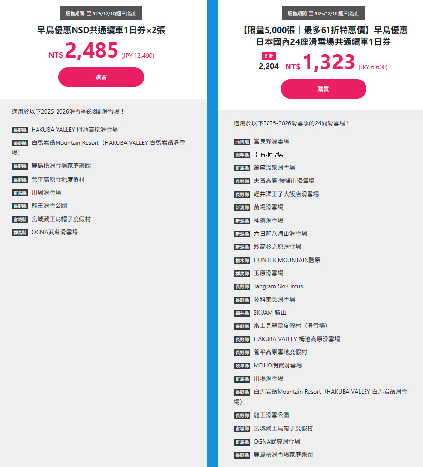 到2019/12/8之前還有『滑雪預約早鳥折扣活動』,有機會以67折~75折的早鳥優惠價格購買到25座滑雪場共通纜車券!!