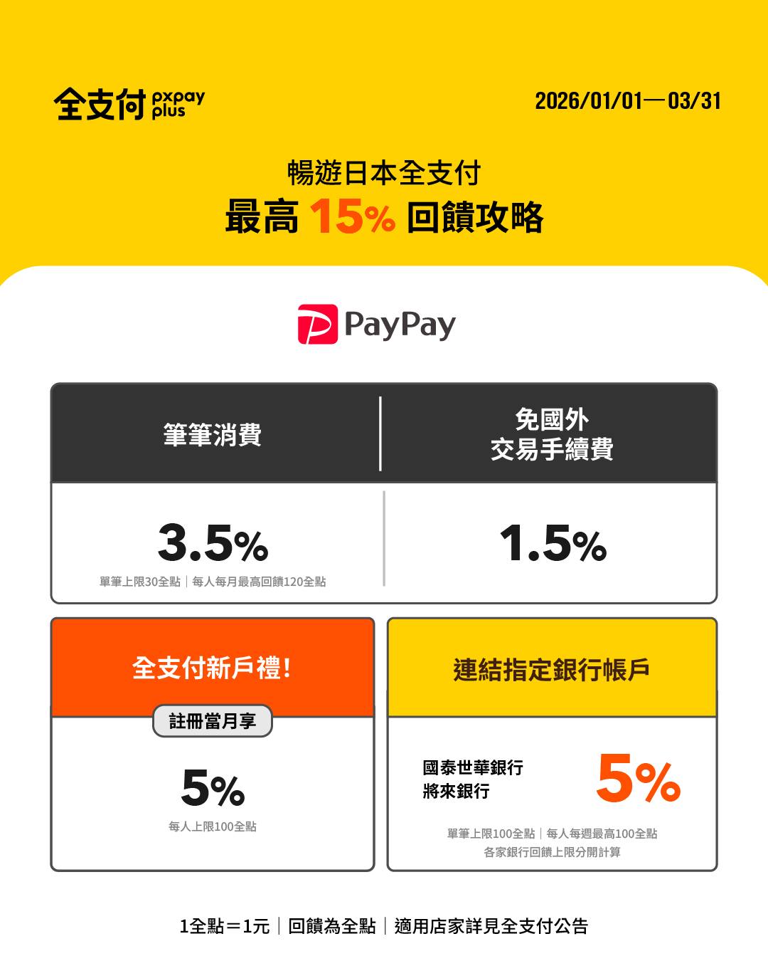 4.連結國泰世華銀行帳戶,跨境再加碼8%全點限量回饋。每一全支付帳號每月最高享150點回饋。