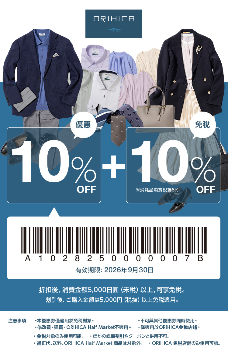 【日本西服AOKI、ORIHICA優惠券】外國旅客可享免稅10%+額外10%折扣 (アオキ)