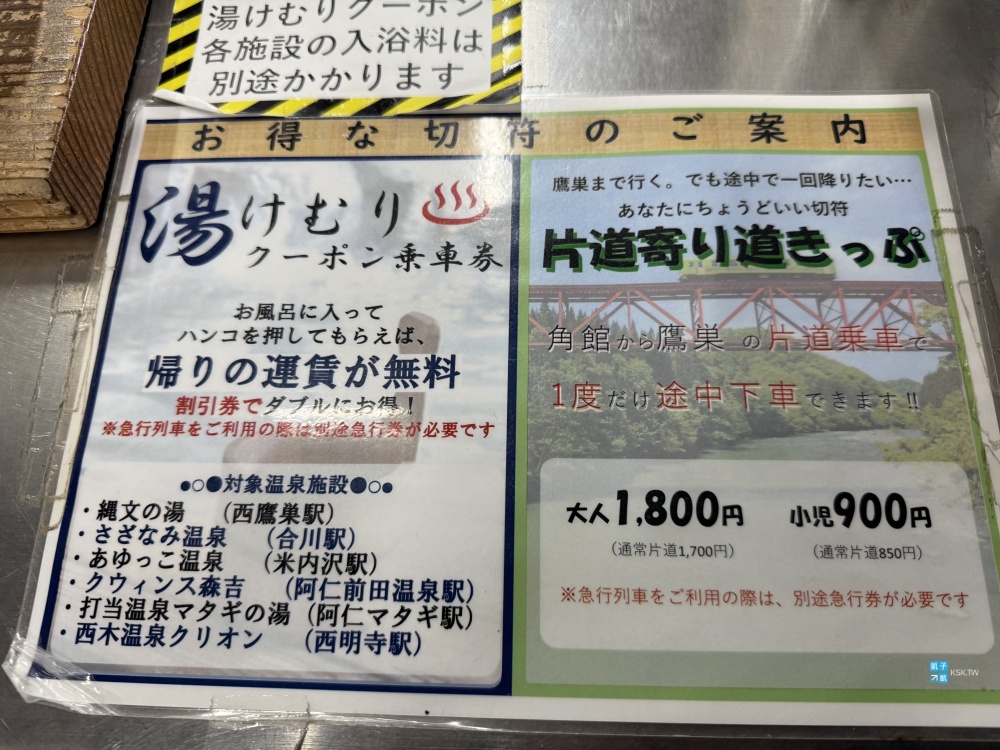 像該次我就是買角館到鷹巢站單程票券1800円,可在中途下車一次。秋田內陸線也有販售A、B type區間與全線的一日乘車券。