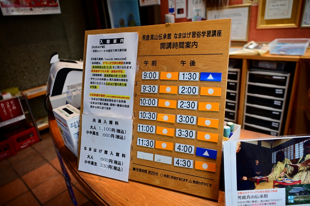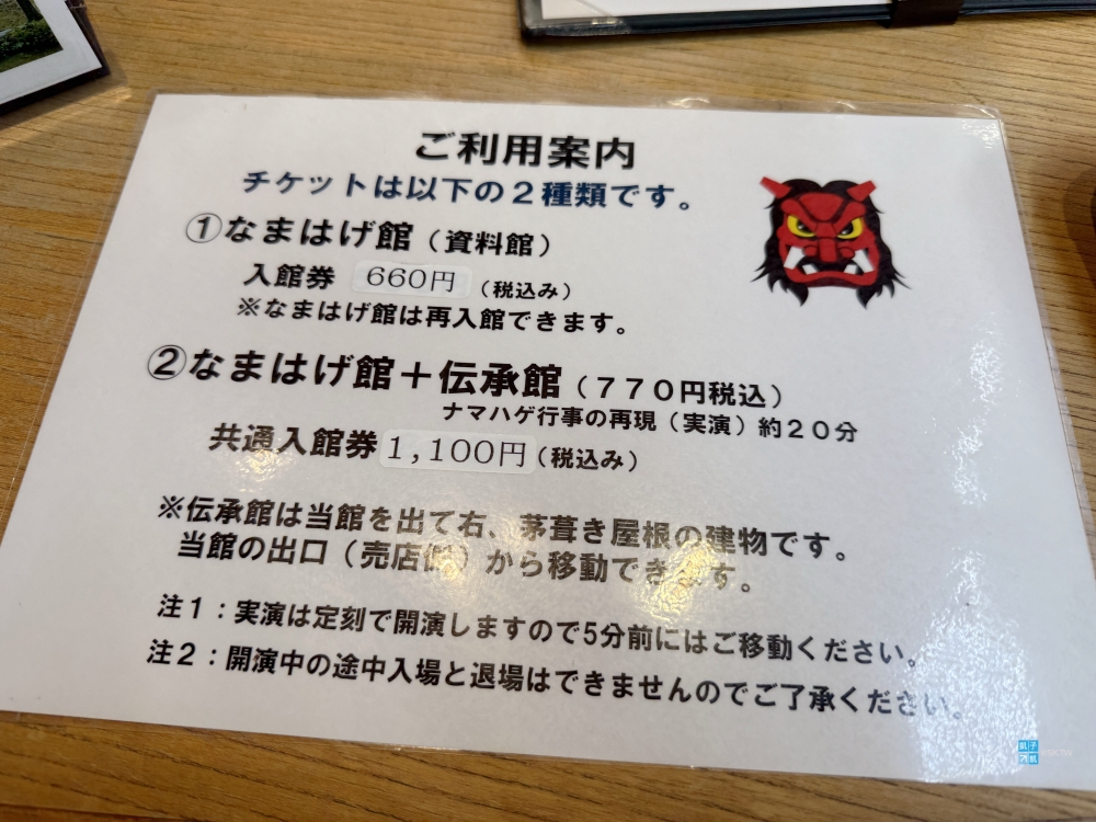 兩館共通入場券是1100円,在「男鹿真山傳承館」裡面有なまはげ的學習講座,大概每半小時就會表演一次,裡面可以看到生剝鬼的表演,聽說不僅小孩子會被嚇到、有時候連大人也都會被嚇哭,但我個人覺得還好啦,可能是我已經有預防心理了XD。現場可以錄影,但手機請記得關靜音啦~