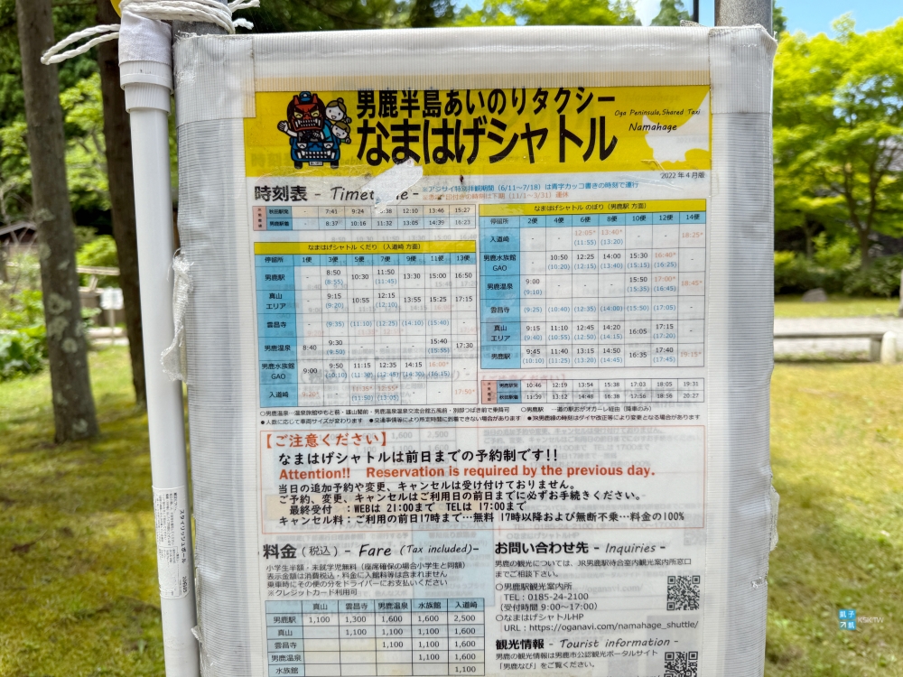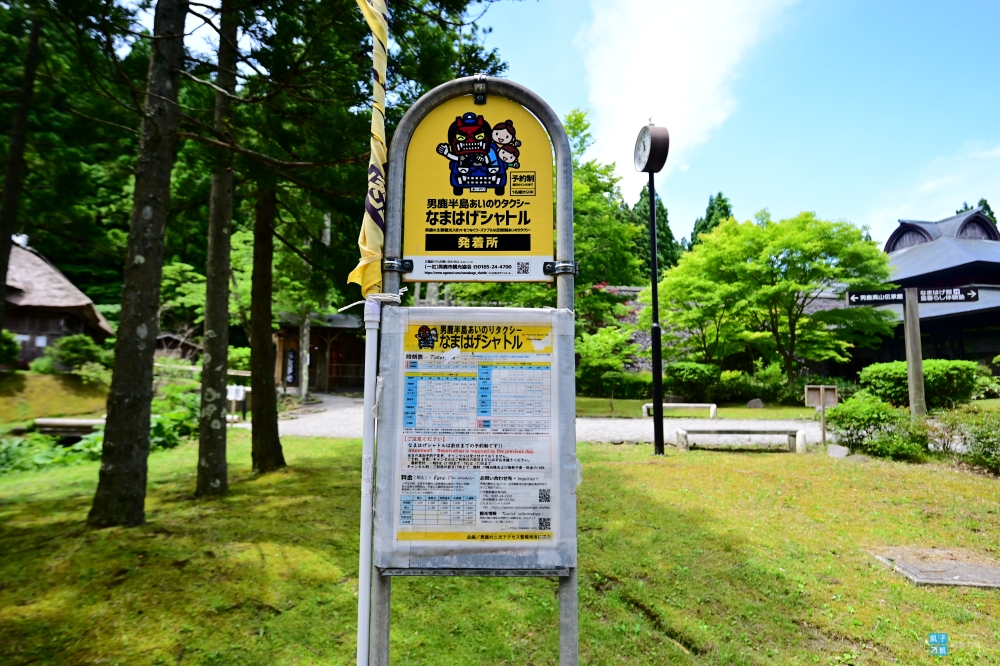 若無法選擇自駕的話,通常是從秋田搭JR到男鹿車站,再利用「男鹿共享觀光計程車服務(なまはげシャトル NAMAHAGE Shuttle)」,必須在前一天完成預約,可以一人或多人使用。