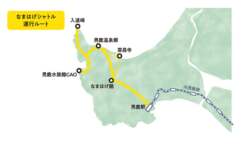 男鹿車站、真山地區(生剝鬼館、男鹿真山傳承館、真山神社)、男鹿溫泉、男鹿水族館GAO、入道崎、雲昌寺(*僅在繡球花觀賞期開放)