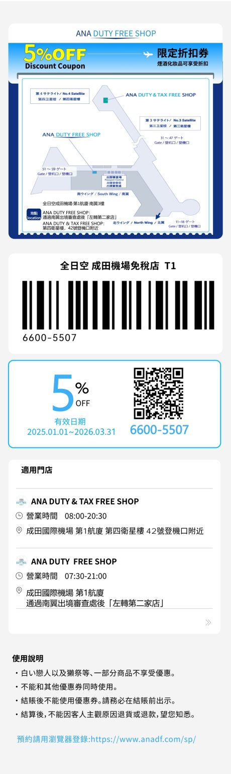 有從成田機場進出的朋友,可以收藏一下這張「ANA 成田機場T1/羽田機場T2 T3免稅店」(ANA DUTY FREE SHOP、全日空免稅店)的優惠券,或許有機會用得到喔,購買化妝品、酒類也可享折扣。結帳時使用此優惠券,可享額外的5% OFF折扣。