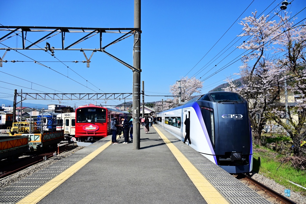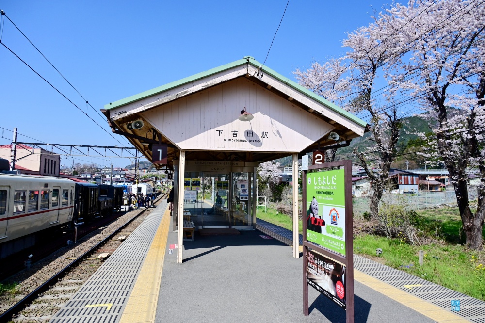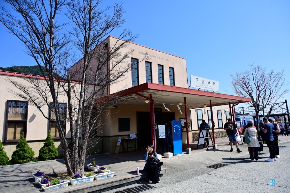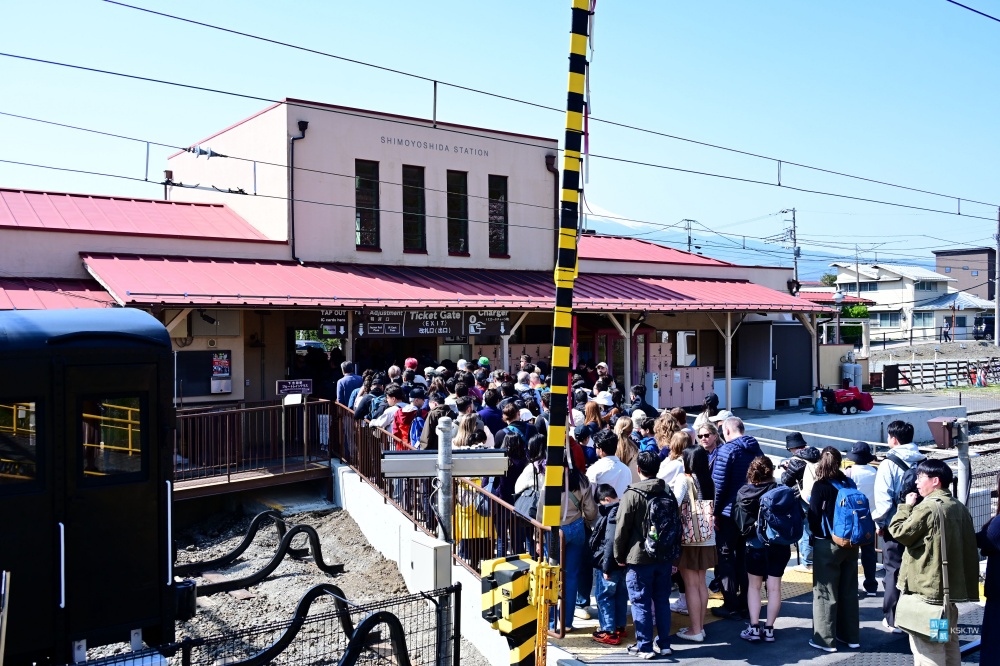 從「下吉田」車站往後看,其實就可以看到後面新倉山上面的櫻花了。櫻花盛開的季節,也可以看到下吉田車站真的超多旅客!這是太熱門的景點了!
