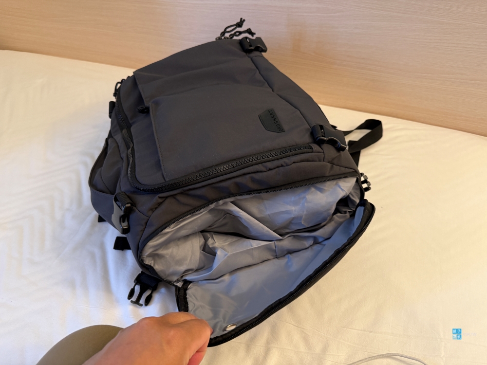 我帶了一機三鏡出門,塞件衣服、毛巾,最後再加個羽絨外套進去都沒問題,真的很能塞!空間算很大的背包!
