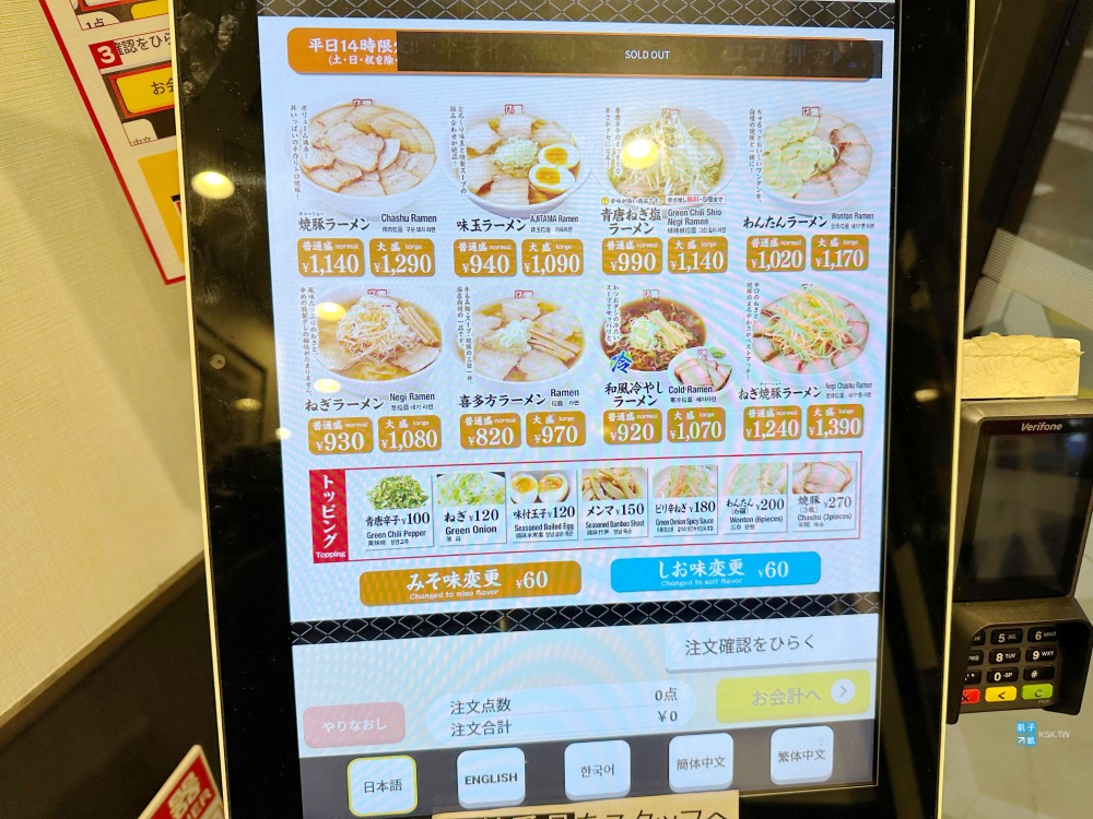 這些名店也逐漸商業化,開起連鎖店來了。平均價位是駱在800-1100日圓之間,使用機器自助點餐也是蠻方便的,很像在吃松屋的感覺。我點了大碗的喜多方拉麵970円。