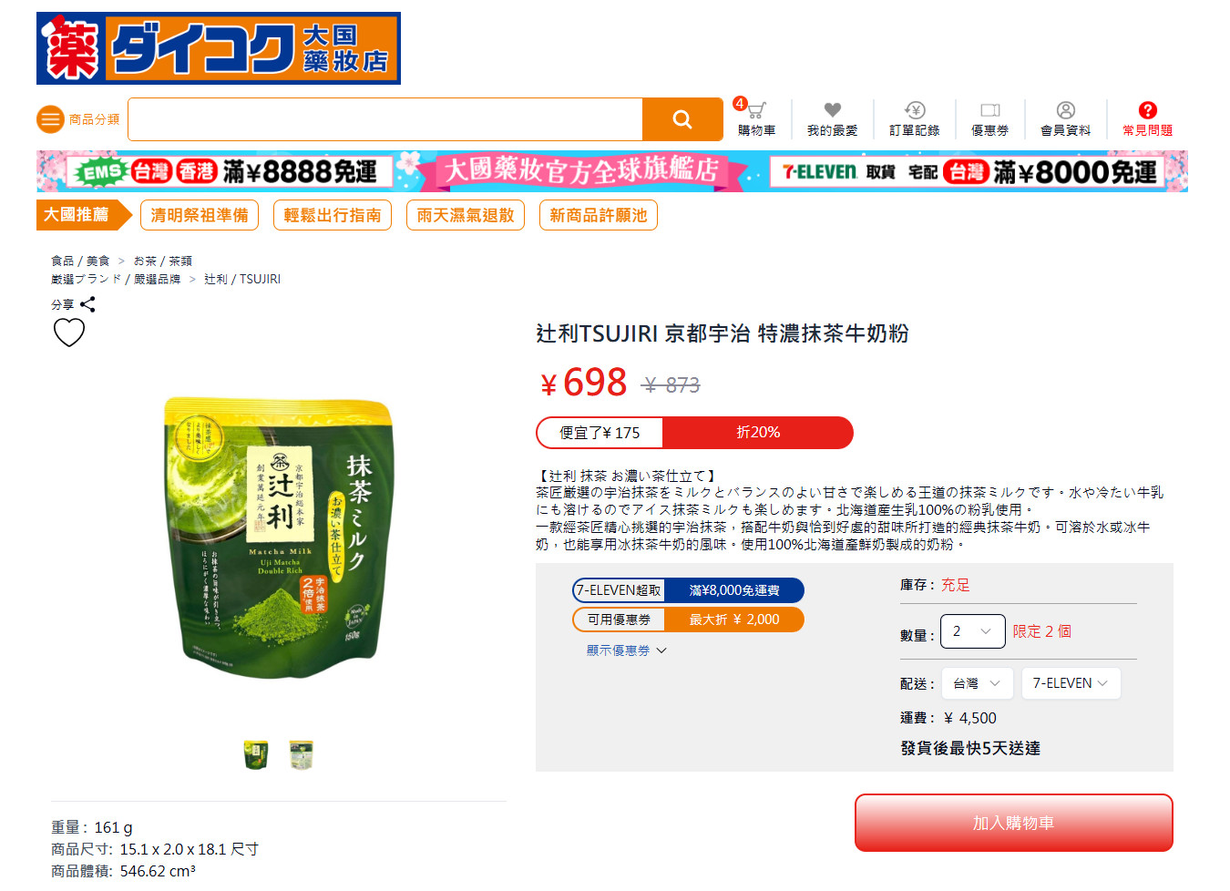 【大國藥妝店】最近還蠻積極推廣線上海外跨境直送服務的,而且我覺得價格其實沒有比日本貴太多,甚至有些做活動還蠻便宜的。本文也提供購物滿一萬日圓就可以折抵1200的優惠券折扣碼,等於是快打88折優惠了。而且目前官網消費滿萬日圓就可以享寄送台灣香港免運,還是用快速的EMS寄送,相當方便!