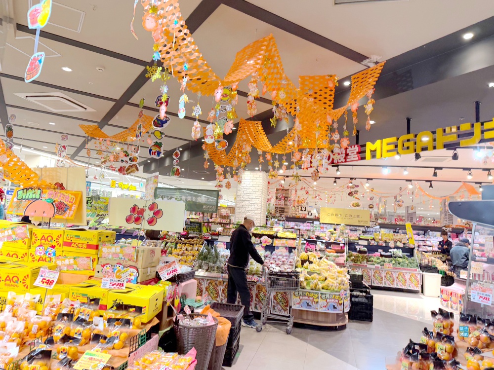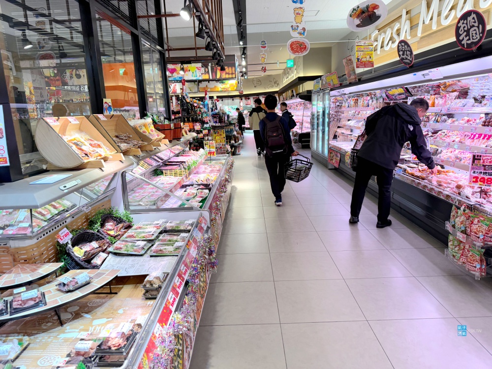 由於是MEGA級的店舖,規模就大上許多,兩個樓層整個平面都是,二樓等於是超市等級,各式水果、肉類、生魚片、飲料….生鮮蔬果通通都有就對了!