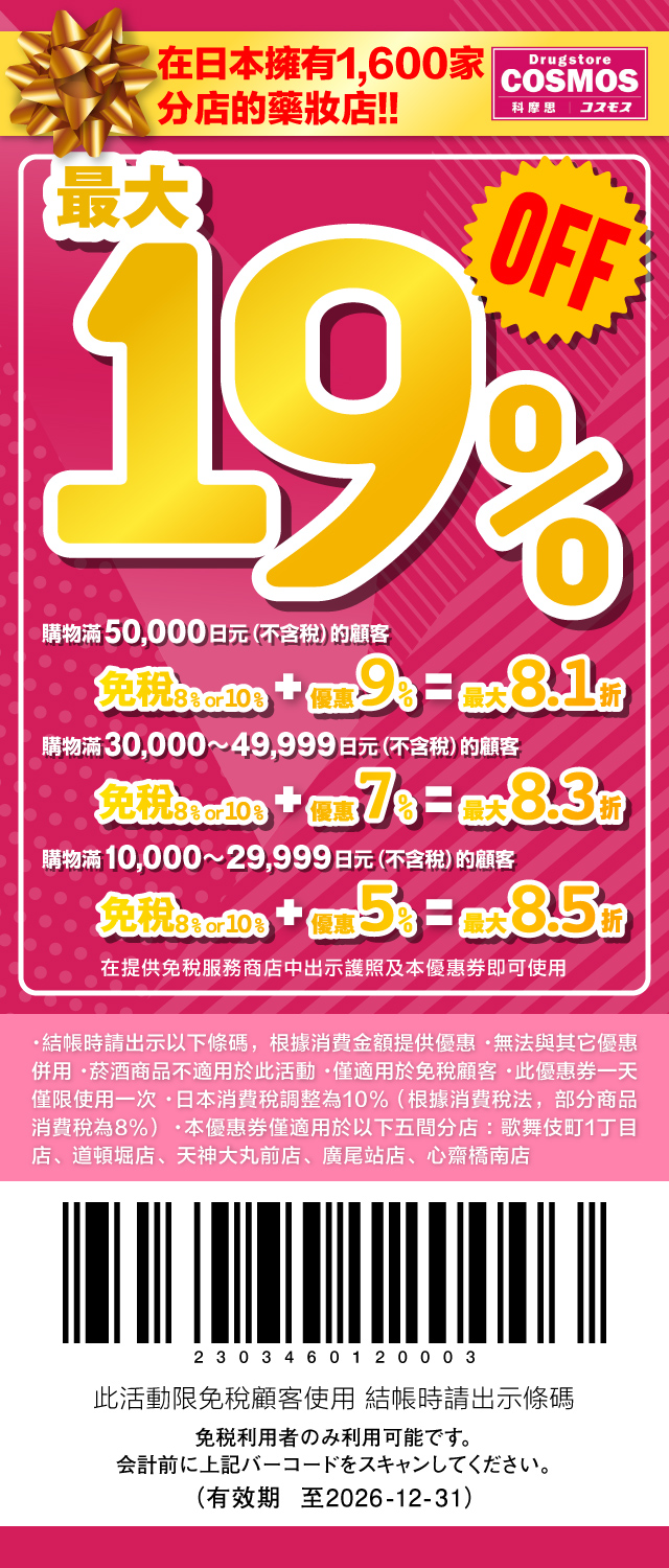 COSMOS藥妝店優惠券介紹文請點此:免稅10%+額外折扣5~9%