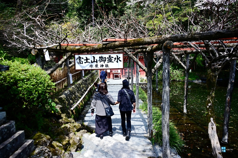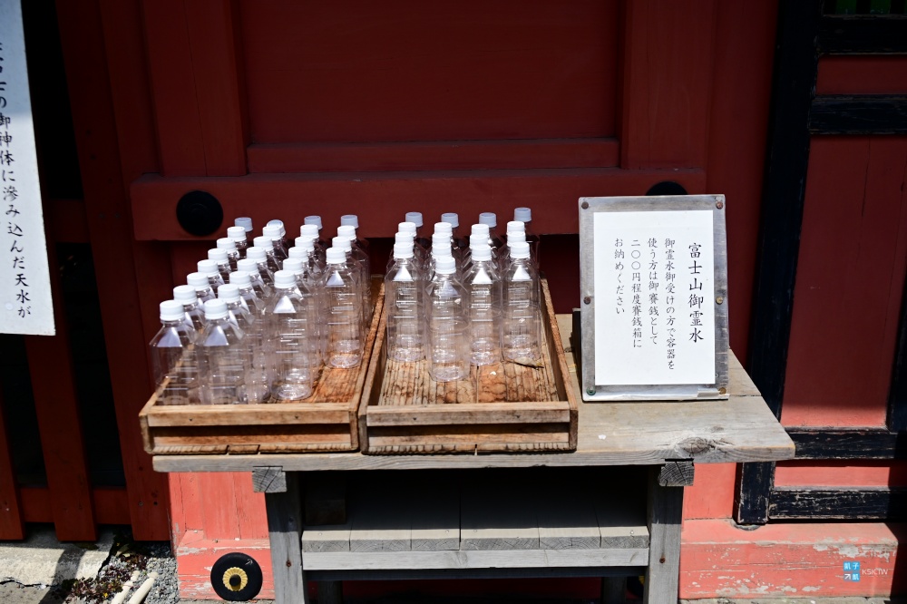 往旁邊一走,可以看到不少民眾用水瓶在裝著「富士山御靈水」。國指定的特別天然紀念物「湧玉池」的水源是來自富士山的融雪,每秒有著2.4kl的流出轉化為伏流水,水溫通年恆定為13℃左右。親自來到這邊見到「湧玉池」,真的會讚嘆日本怎麼隨便一個池子都能維護得這麼乾淨啊!環境真的是很好!