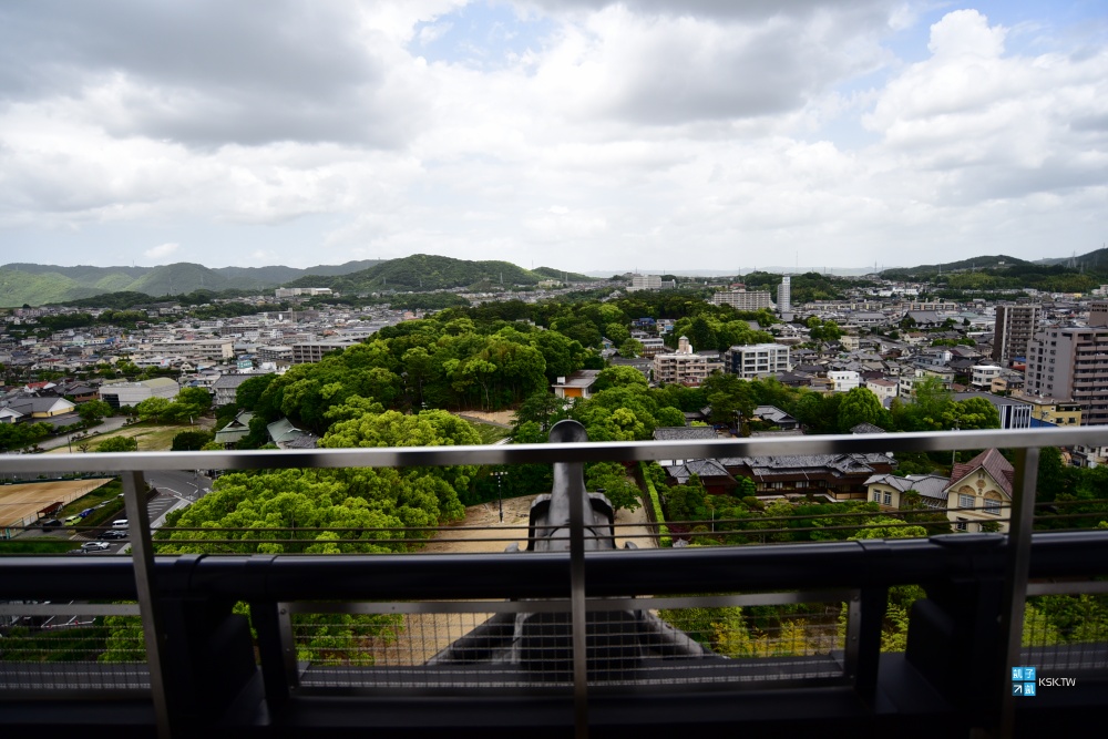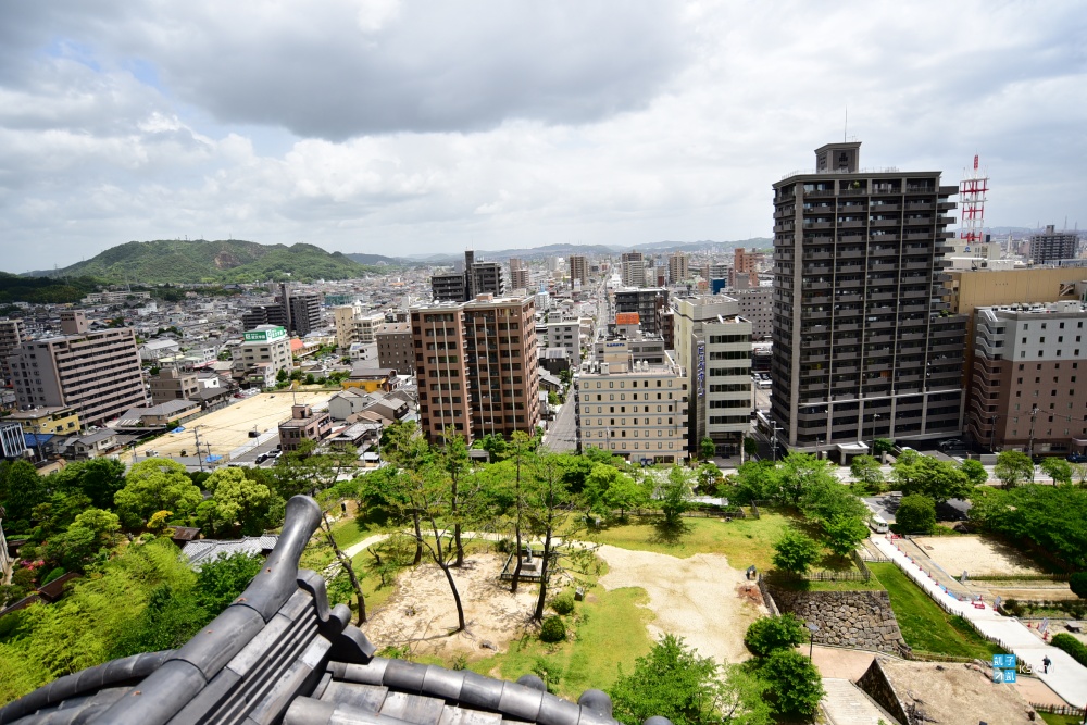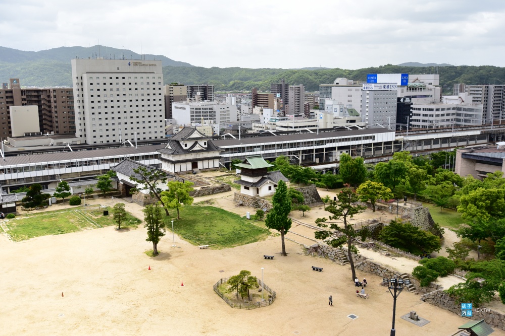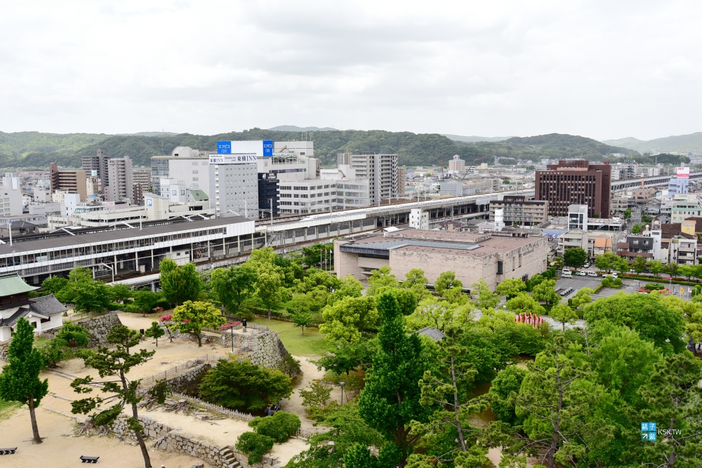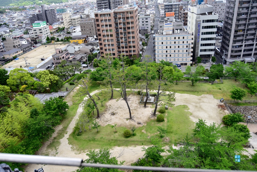 來到天守閣這邊的視野也是相當好的,望過去即可見到福山車站跟山陽新幹線經過的畫面。從地圖看來,福山城周邊也是種滿著許多櫻花樹,或許也是您春天來到山陽地方賞櫻的好選擇!