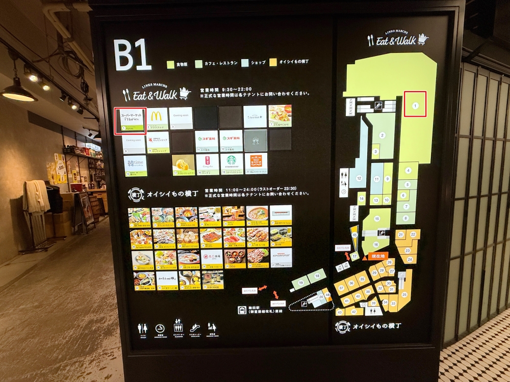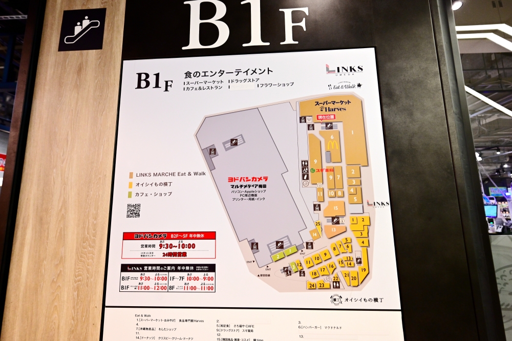 來到LINKS UMEDA的B1樓,可以看到下圖的1號區塊,佔據一大塊的就是「Harves LINKS 梅田店」的所在位置。實際上它是被規劃在「LINKS MARCHE Eat & Walk」這一區裡面,日本很喜歡用MARCHE這個法文代表”市場”的意思。