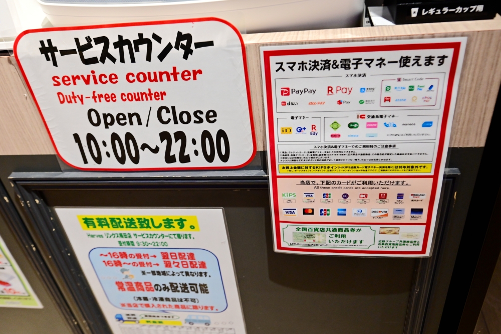 地上也都會劃有「TAX FREE」的指標,相當清楚!免稅櫃檯的營業時間是10:00~22:00,因此您晚上過來購物,基本上都不太需要擔心免稅櫃台未開放的問題。店內消費累積滿5000日圓(未稅)以上,就可以申請免稅!店內支援的付款方式相當多元,像是信用卡結帳、PayPay等電子支付、Suica等交通IC卡付款,都是沒問題的!