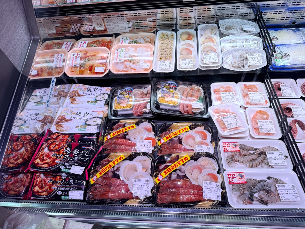 最誇張的是現場還可以看到很多BBQ用的海鮮大拼盤,真的是只能用物美價廉來形容。海鮮控的朋友,真的會看著冷藏庫裡面的食材越看越餓、一直流口水的程度啊!如果您有機會在日本烤肉的話,一定要來這邊選購各種食材,實在太值得一逛的一間超市了!