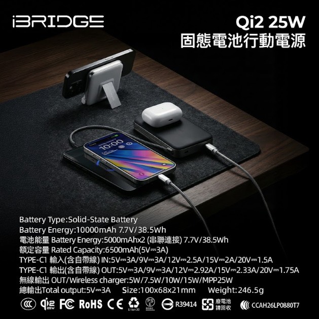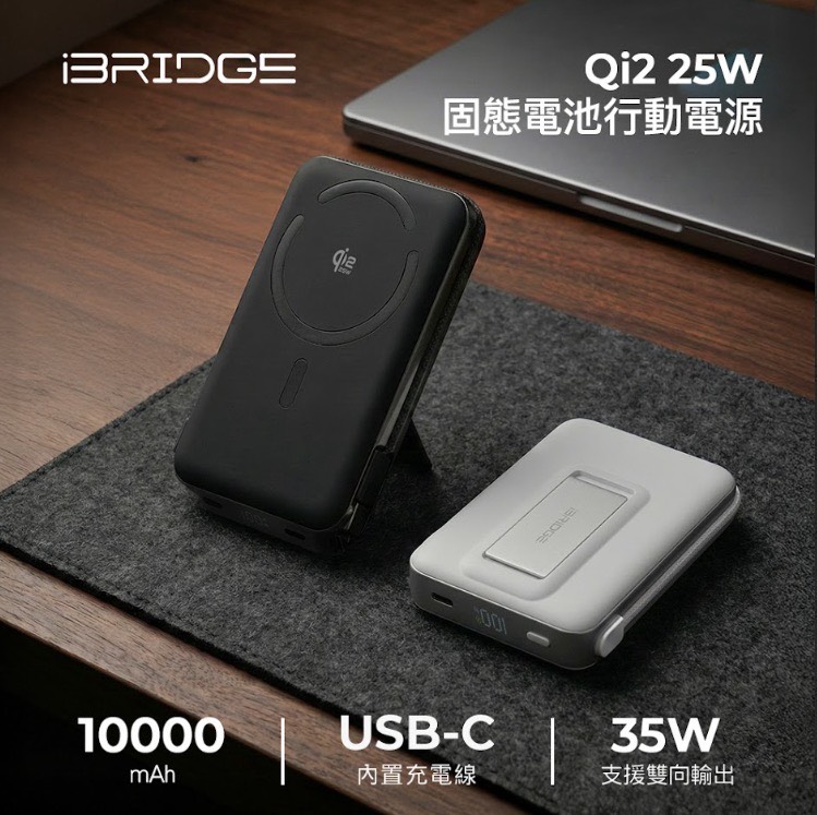 【iBRIDGE】10000mAh Qi2 25W固態電池行動電源