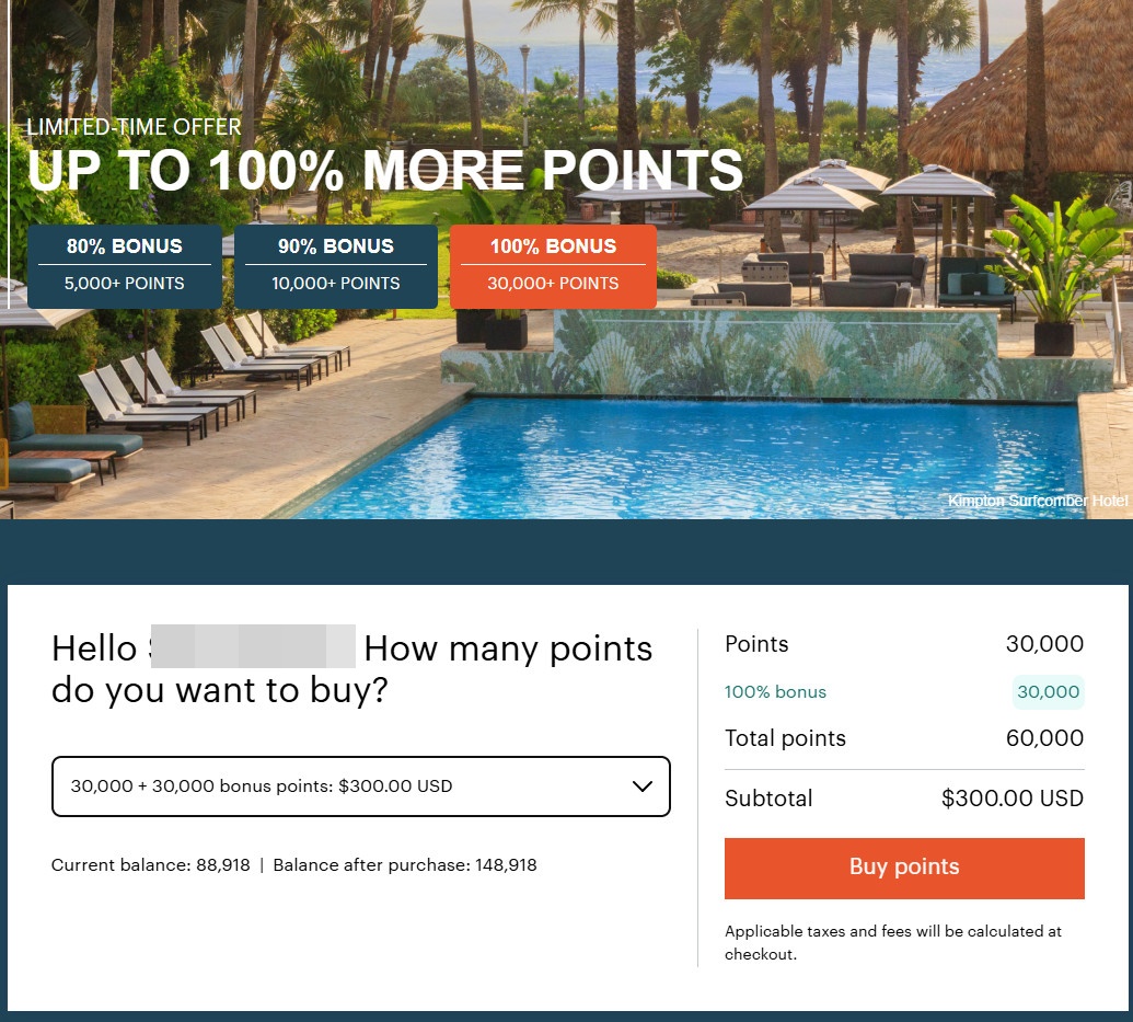 IHG常會舉行點數特賣,特別是100% Bonus就是最佳購入好時機!IHG點房是浮動價格的,每晚的所需點數也都不太相同,另外也要注意有些飯店是含稅、有些則是還要加個10%的稅。所以您訂房時還是要精算一下,有時候可能訂下來不見得比您透過訂房網站還划算,有時候則是有機會省下一半房價。如果您可以找到一晚10000點的積分房,那就是台幣只要1400-1500元。