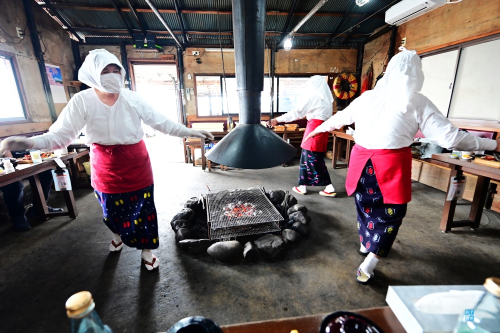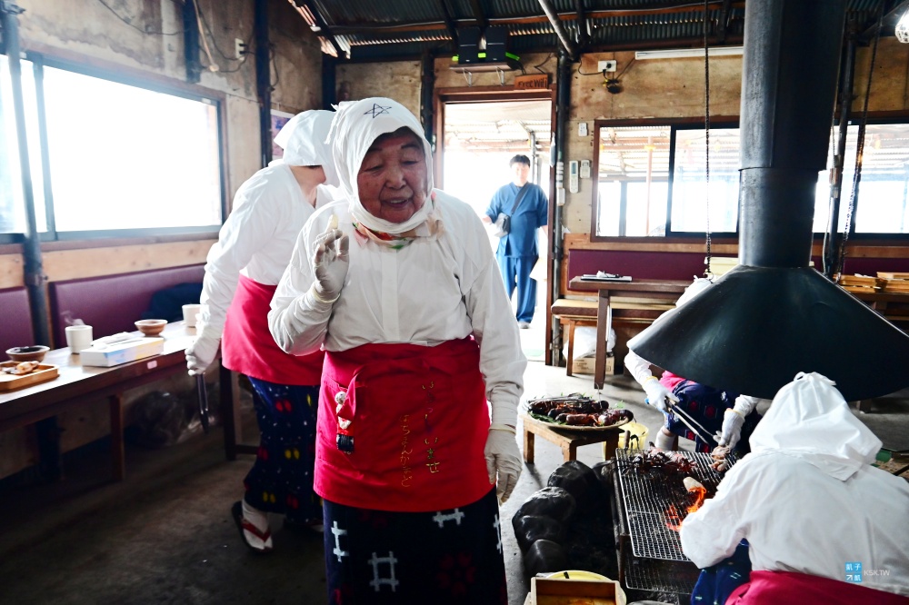 而其中最資深的,竟然是一位94歲的海女阿嬤,她仍然很有元氣地、走到我們面前,親自跟我們分享海女工作的一切。原來她從10歲就開始當海女了,這間「海女小屋」可是她在70幾歲時才決定創業,現場負責燒烤跟表演的其他海女阿嬤們年紀也都蠻大的了,絕大部分都還是現役的海女喔!