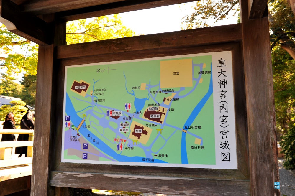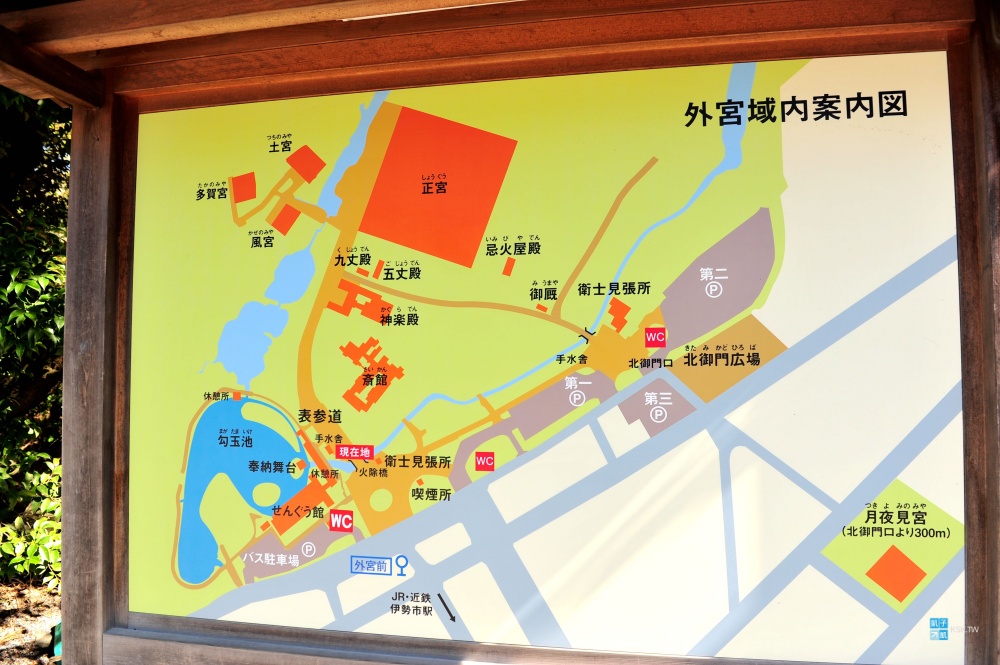 外宮前這邊,可以看到手水舍、奉納舞台,往裡面走到正宮,後續還可以參拜重要的三個別宮(多賀宮、土宮、風宮)。