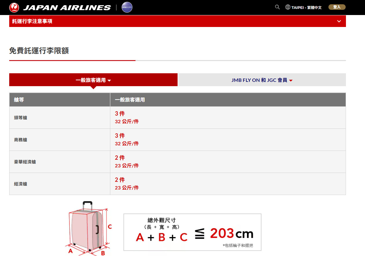 日航商務艙有三件託運行李的額度,而且每件上限是32公斤,搭JAL很適合搬日本家電啊!(所以我跟朋友兩位都開商務艙的話,一個人可以帶到96公斤,兩個人就可以帶快兩百公斤的托運行李了嗎??….當然,我們沒有那麼會買啦!)