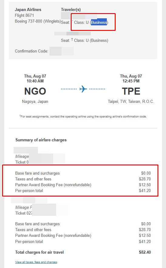 下面是阿拉斯加航空里程開票的信件,艙等 Class: U (Business)