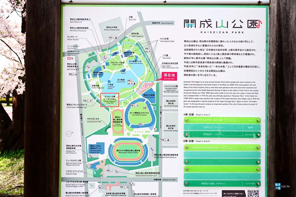 像是您這天如果有安排三春瀧櫻、 藤田川、二本松城….等鄰近景點的行程,也都可以順便安插個空檔來到「開成山公園」。郡山算是福島很熱鬧的住宿點,也有新幹線經過的車站。