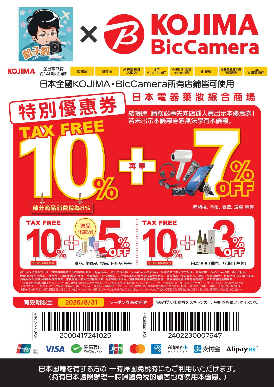 您也可以使用這張Bic Camera跟Kojima電器都可以通用的免稅10%+額外折扣3%~7%的優惠券啦!