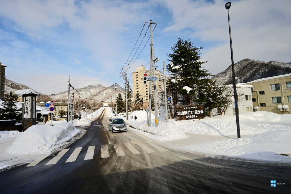 但說實在的,定山溪的冬天雪景還蠻漂亮的,如果您想更悠閒地到溫泉街逛逛,泡個足湯,那或許可以回程就考慮自己搭巴士返回札幌,這樣時間會比較足夠。我隔天早上睡比較晚的原因,就沒有再走下去拍溫泉街的景色,離開時覺得有點可惜,還好前一天傍晚有稍微走進去拍一下。