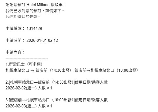 萬世閣飯店有提供札幌車站北口的來回接送服務。可以直接在官網預約,蠻方便的,也有中文頁面,有收到確認信的話,大致就是沒問題。我是預約去程14:30札幌站北口,隔天10:00從飯店出發回札幌。這樣又省了來回定山溪的車資,還不錯!