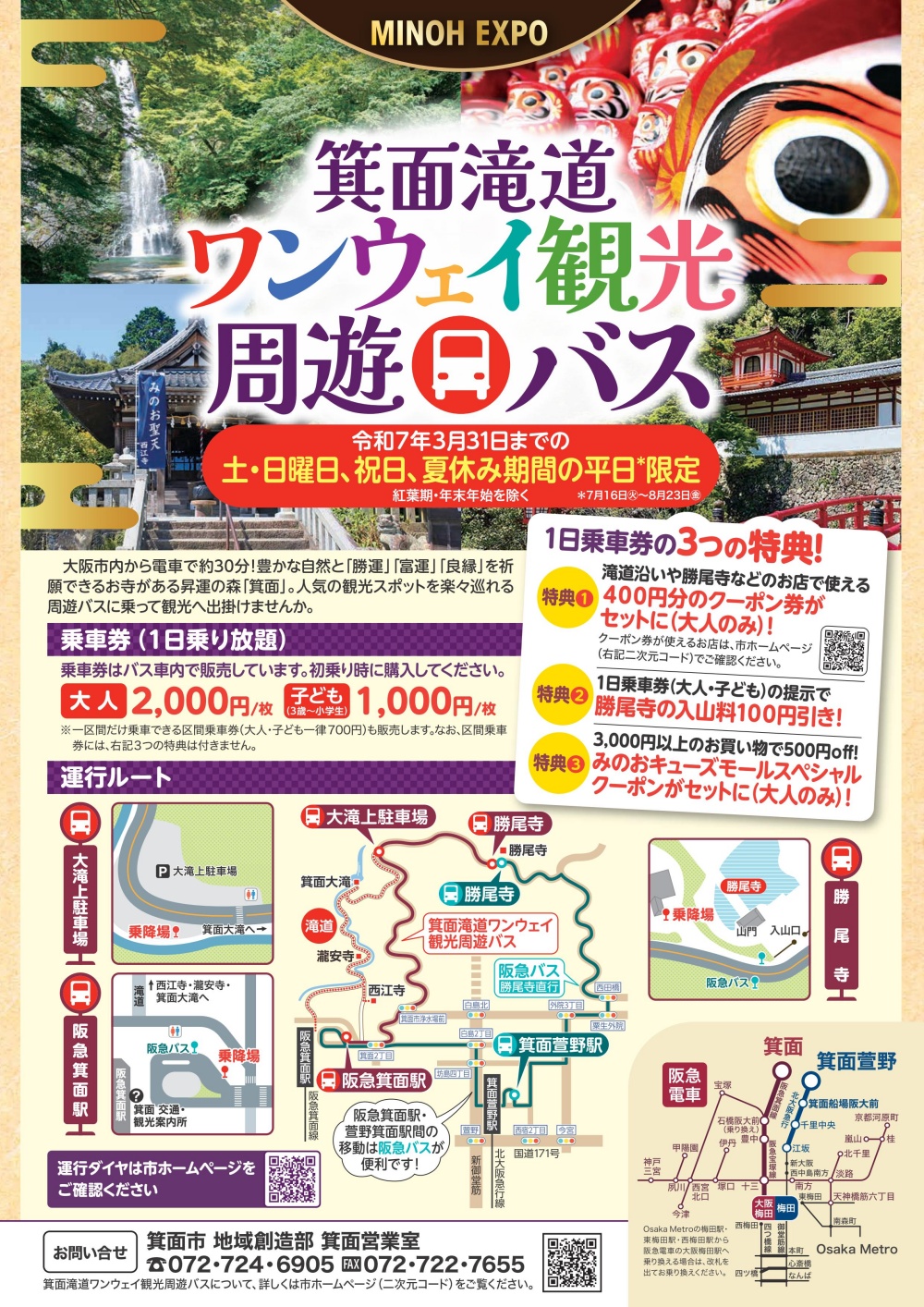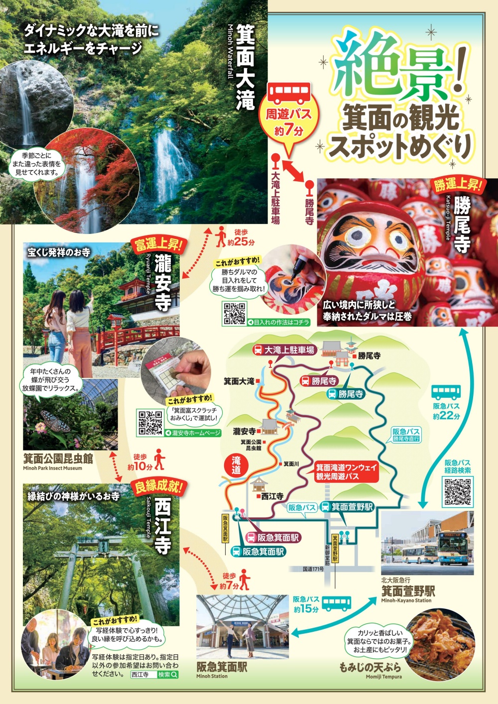 這天行程:地鐵至「箕面萱野」站 ⭢ 6號月台搭阪急巴士上山 ⭢ 勝尾寺 ⭢ 步行50分至箕面大瀑布(或搭巴士,注意運行日期)⭢ 瀧安寺 ⭢ 阪急「箕面」站,回大阪梅田