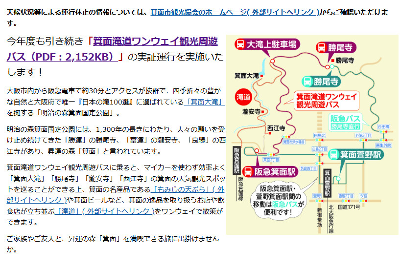 我記得箕面這邊2025年也是有熊出沒的消息,畢竟這邊是屬於山區,近期要走這段路的話,可能也不是那麼建議,因此2025年的話就建議您考慮搭個計程車或利用12/2之後有恢復運行的「箕面滝道ワンウェイ観光周遊バス」吧!