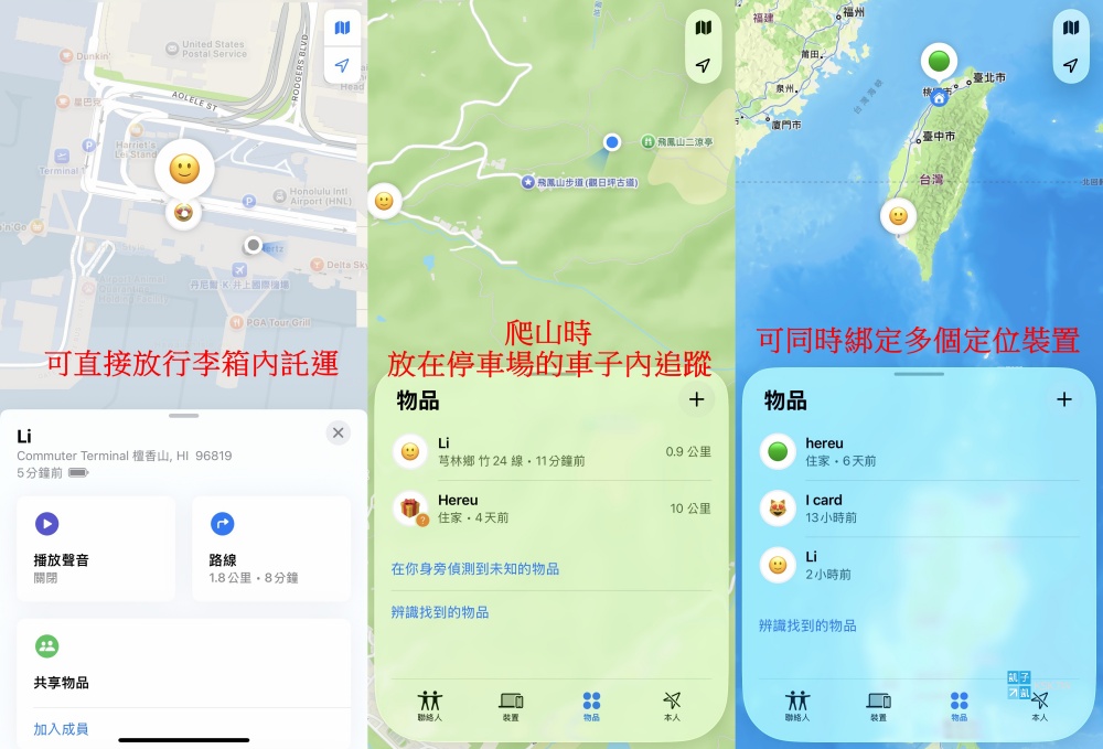 c.帶小孩或者長輩出國,擔心他們走失,可以放一顆在他們身上備著。或者自己重要包包裡面也可以藏一個,像去歐洲就蠻需要擔心扒手的~