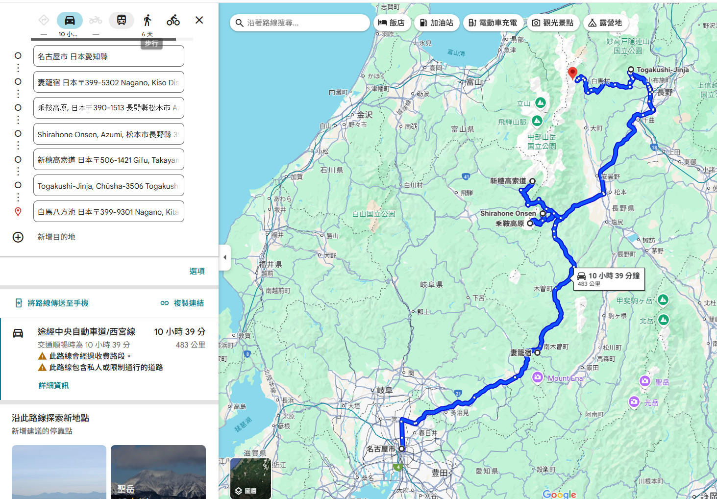 當時排這個行程,最傷腦筋的就是第一天,到底要住木曾福島、松本,還是大町溫泉鄉呢?剛好這天還遇到週六晚上比較貴….最後決定第一天就拉比較遠的車程,直殺白馬住宿了!