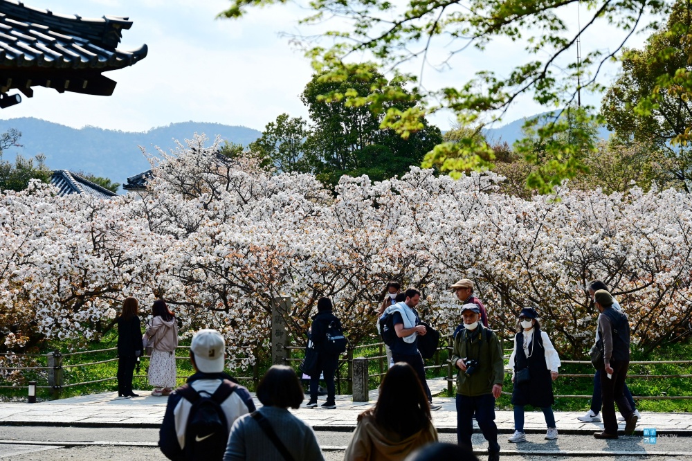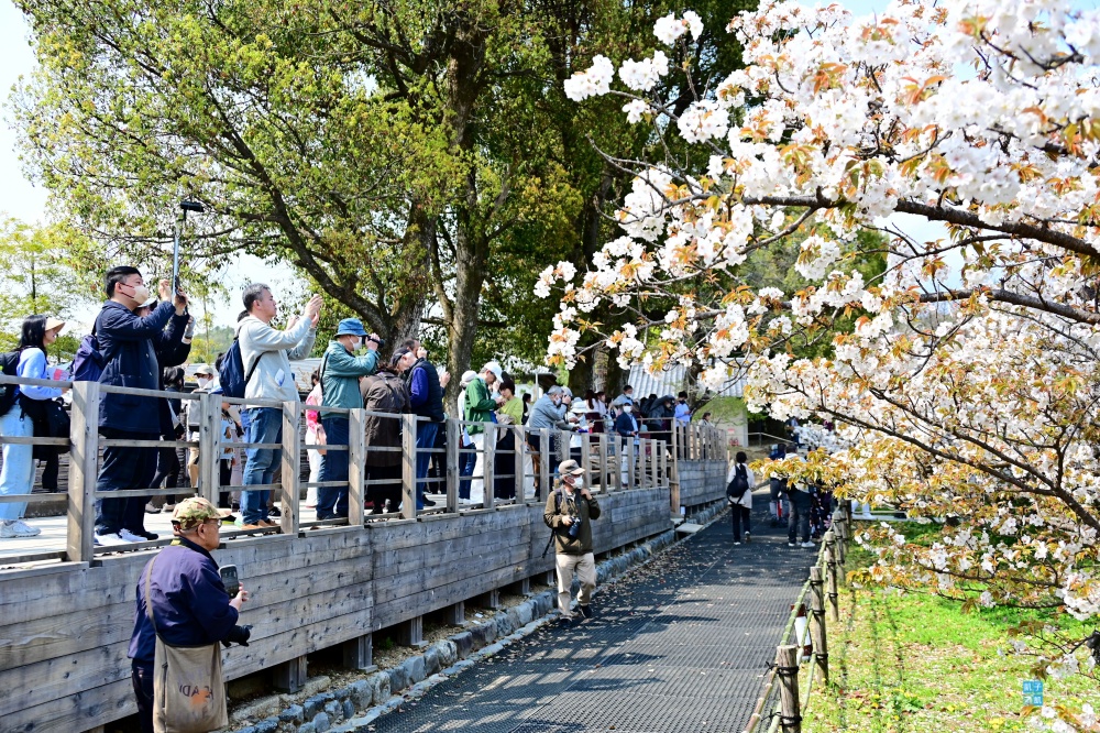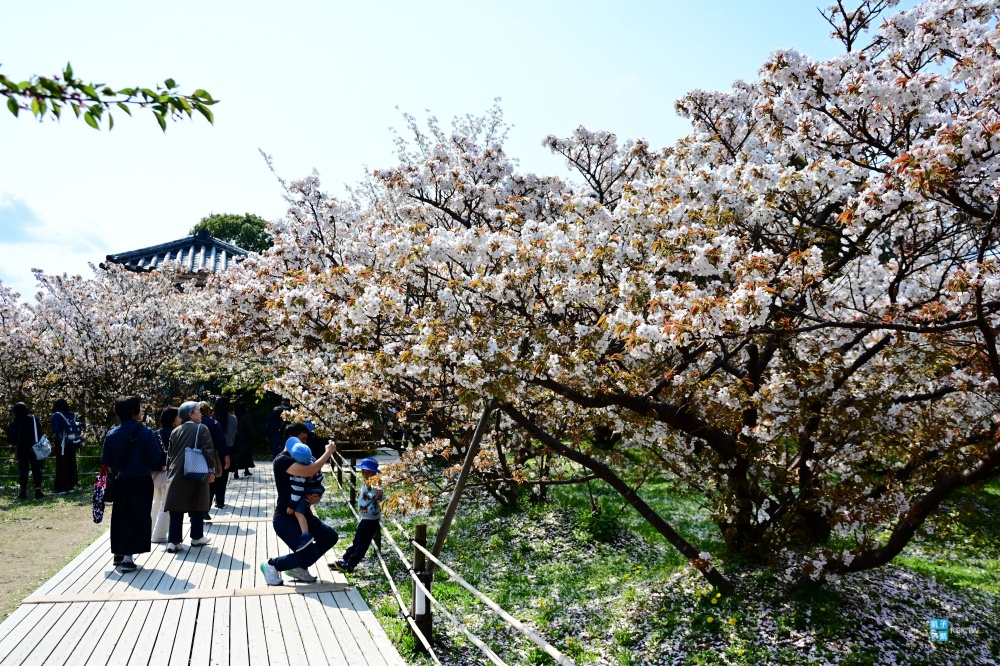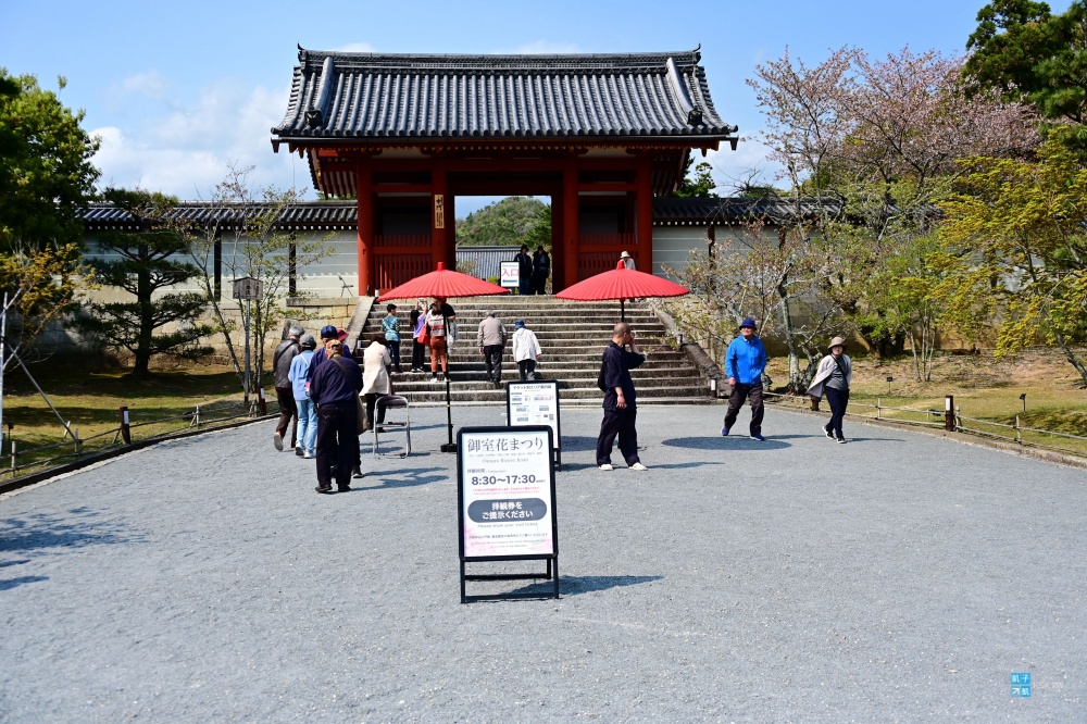 從「御所庭園」出來之後,繼續走向「中門」,左側就是整片「御室櫻」的栽種區,往後面走會有一個展望平台,可以拍到御室櫻搭配五重塔的畫面,人潮大概都擠在這區。