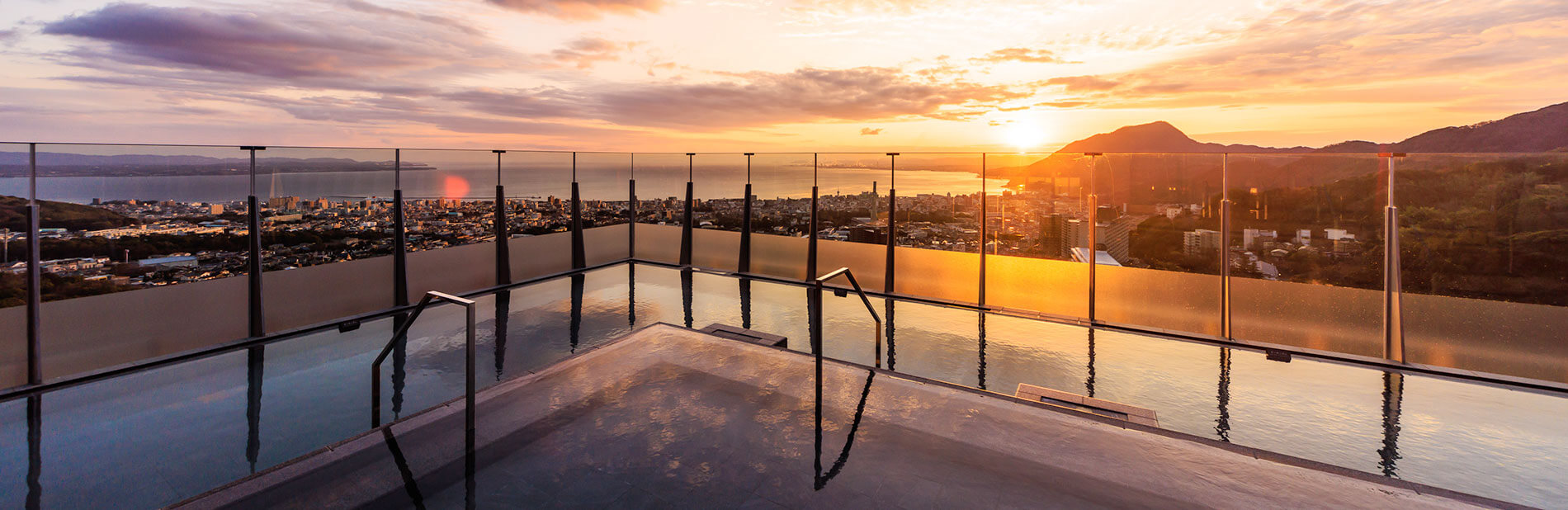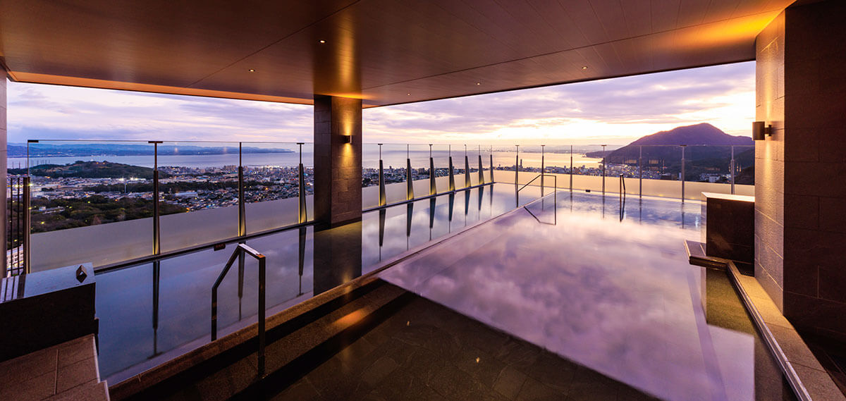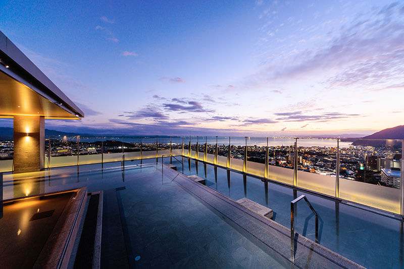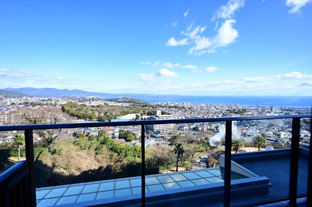 「宙湯」的特色就是位於高樓層,眼前直接面對的就是別府灣的景色,由高處欣賞別府灣的景色相當美。轉過頭一看,後面就是一座高大的鶴見岳,真的就是依山傍海的露天溫泉池,頂樓宙湯的風景我覺得就已經相當厲害了。