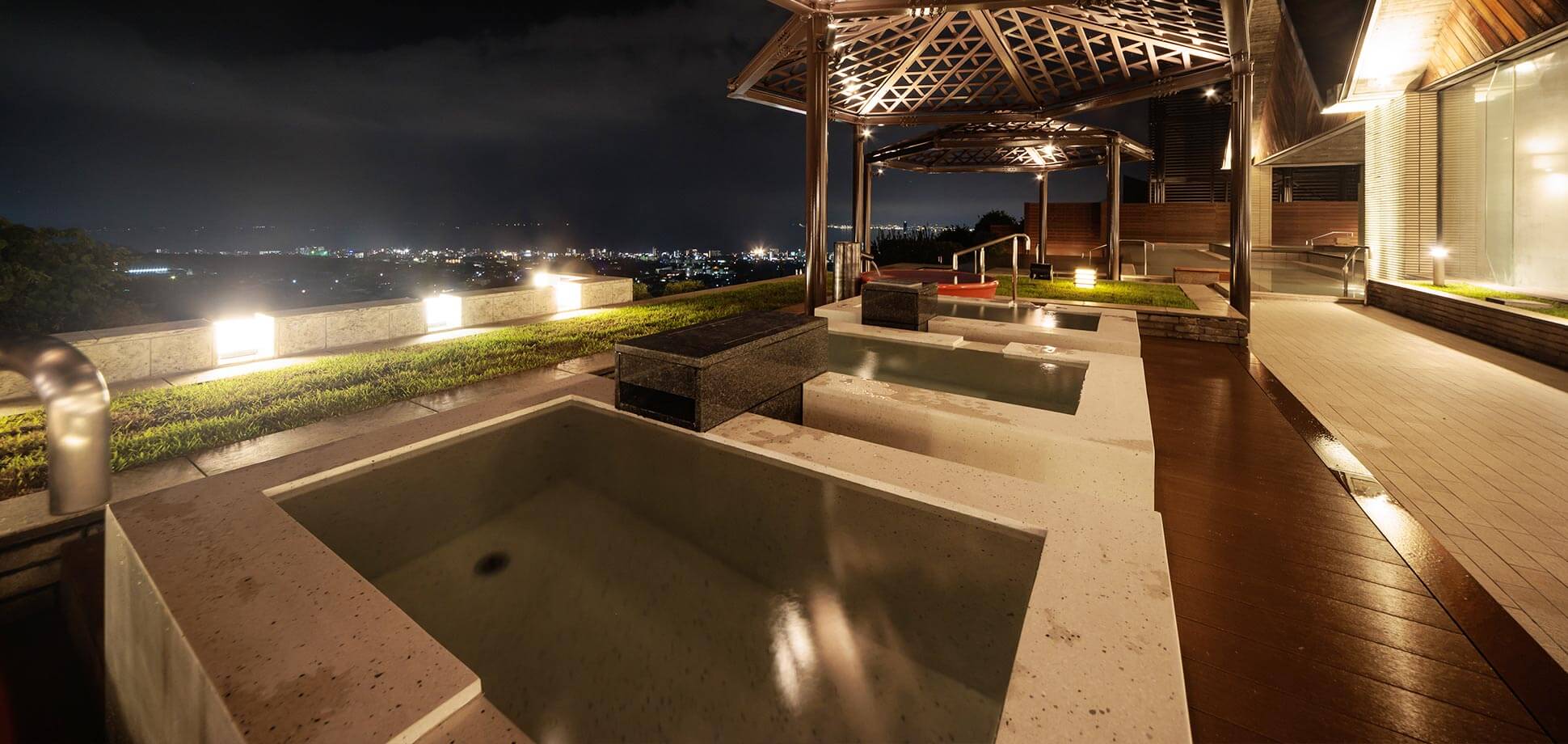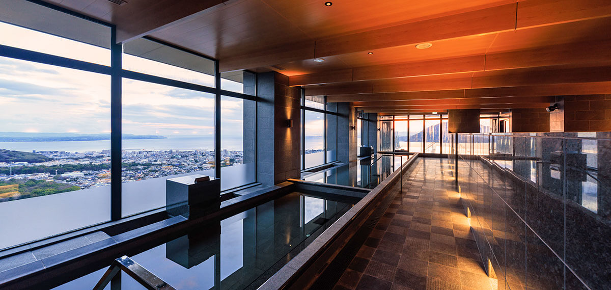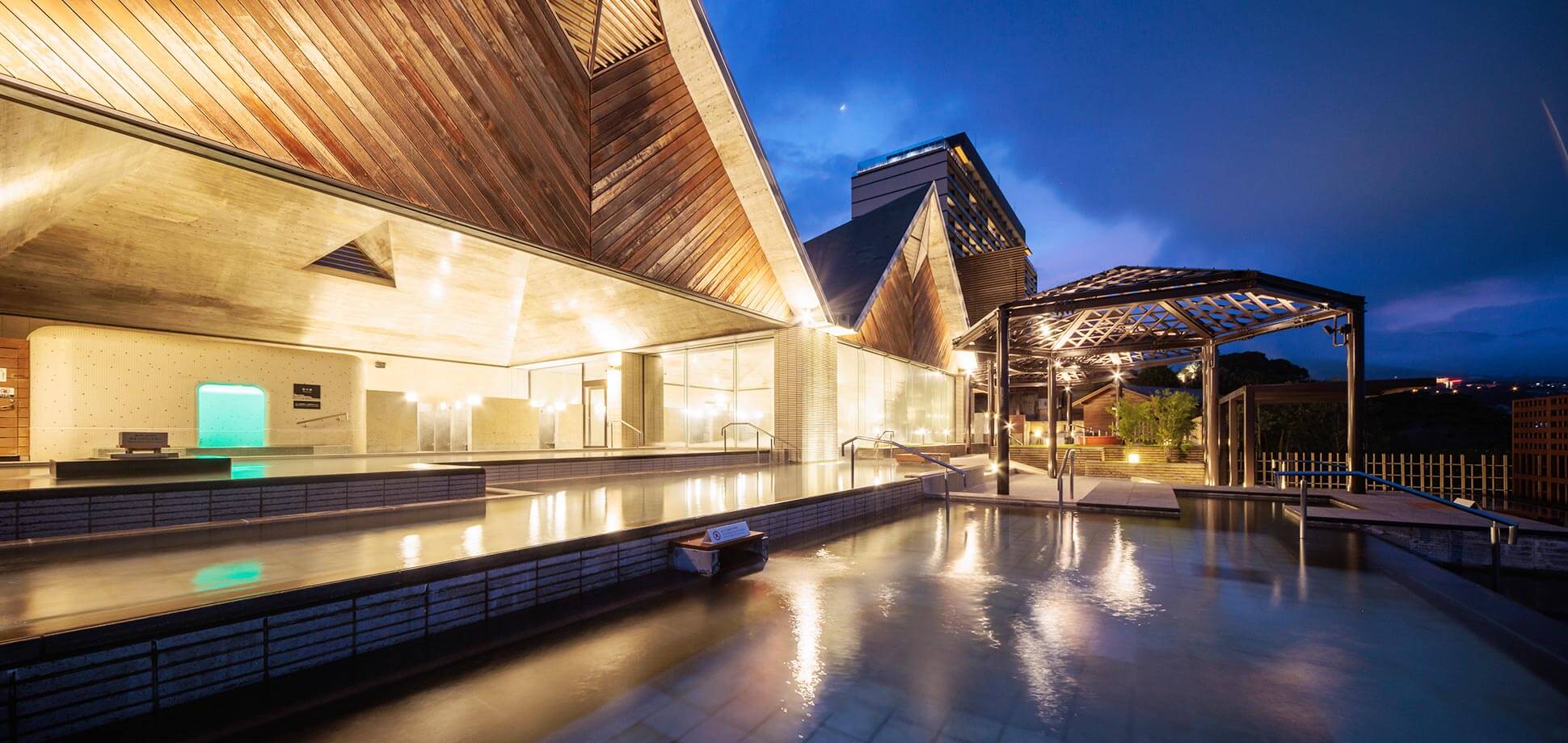 位於宙館的頂樓(13樓),有分為內湯跟外湯。推薦您在沖完澡之後可以先到內湯泡一下,讓身體熱起來之後,再到外湯去邊欣賞風景邊泡著好湯。