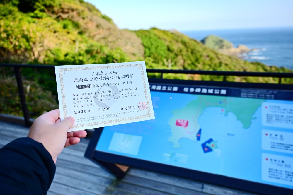 另外也補充一個很特別的景點,是日本本土最南端的「佐多岬」海岸,來到這邊的觀光案內所將可以免費索取日本本土四極地的到達證明書當作紀念。這裡是位於北緯31度,跟印度的新德里、埃及的開羅相同。到這邊還可以走一段步道前往欣賞周圍的海景,特別推薦在傍晚的日落時分前來,色溫相當美。事實上,這個景點是屬於鹿兒島縣的南大隅町,但其實您從宮崎南部這邊過去的距離也差不多,因此一同在這邊跟大家分享,這樣是不是更有在執行深度旅遊的感覺呢!?但也請注意,這個日本本土最南端的景點來回可是一大段的距離,建議評估過車程時間再決定是否前往喔!