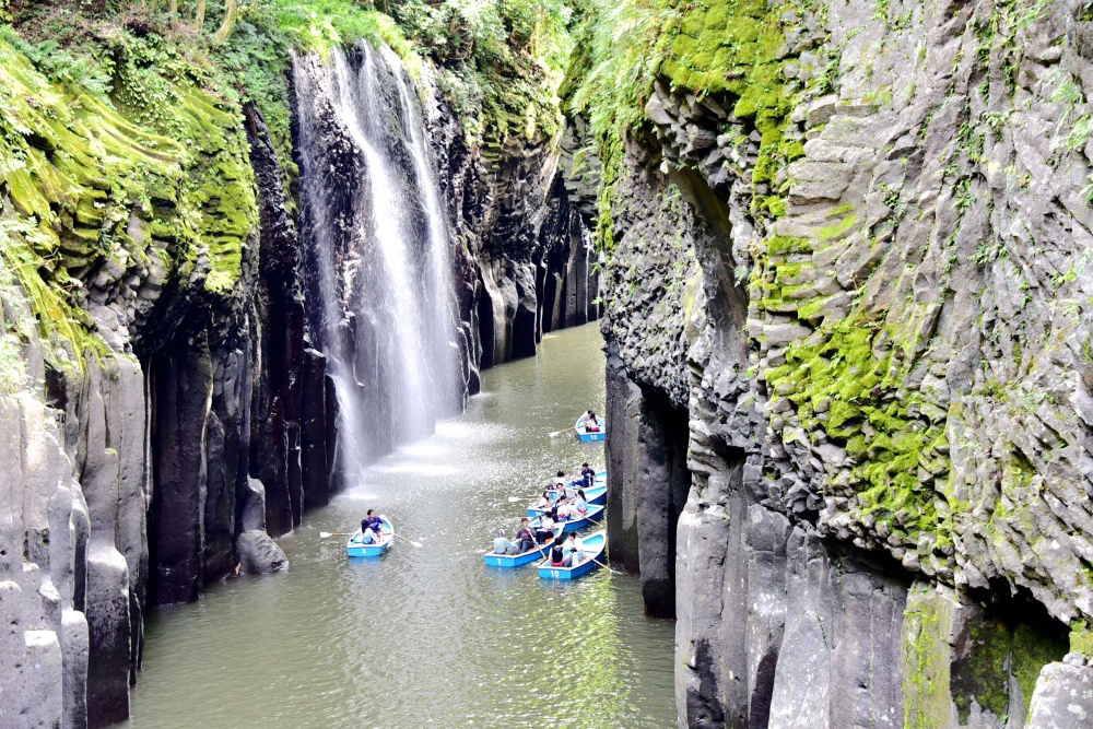 先來介紹「宮崎縣」的景點,其中最深受旅客喜愛的就是「高千穗峽」這個最具代表性的景點,這是由火山地形與河川侵襲所形成的峽谷。懸崖峭壁高達80至100公尺的V型深谷、搭配日本百選瀑布的「真名井瀑布」,以及翠綠溪水搭配而成絕美的畫面,是來到宮崎必訪的景點。