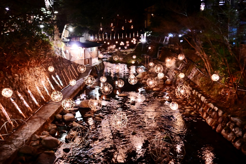 在冬季的「黑川溫泉」這邊也會舉辦「湯明(湯あかり)」竹燈祭,一顆顆的圓形「鞠燈籠」由九根竹條編織而成,這些燈也是由這邊旅館與商店的人蒐集材料,手工製作而成,藉由著晚上的竹燈光,顯示愛護這片土地的心。這個點燈活動至今已有14年的歷史,現場約有300個球體形狀「鞠燈籠」,從溪流到溫泉街都有點燈,當天晚上我們也看到一些日本旅客穿著浴衣出來拍照,真的是很有日本味的一個溫泉地呢!