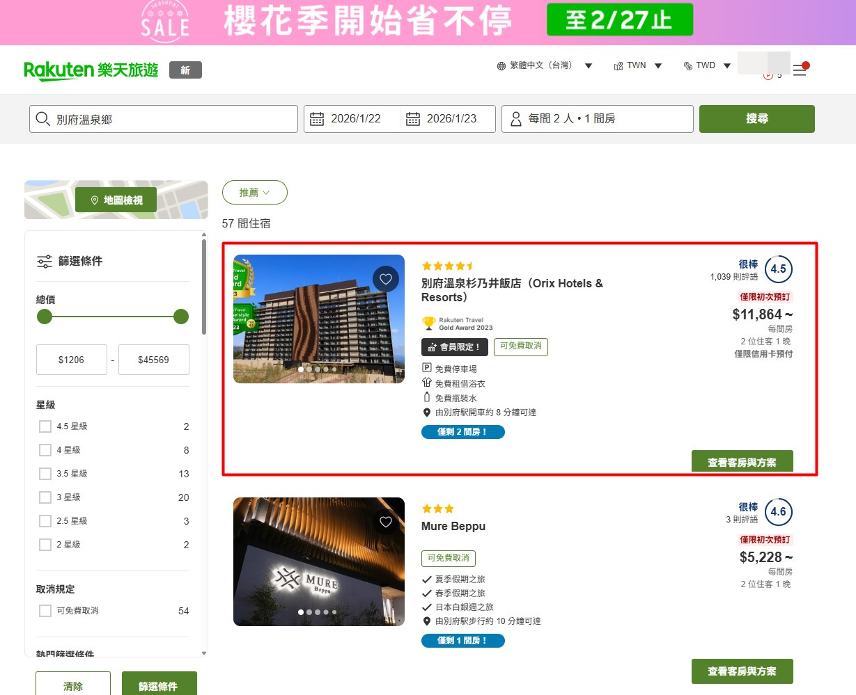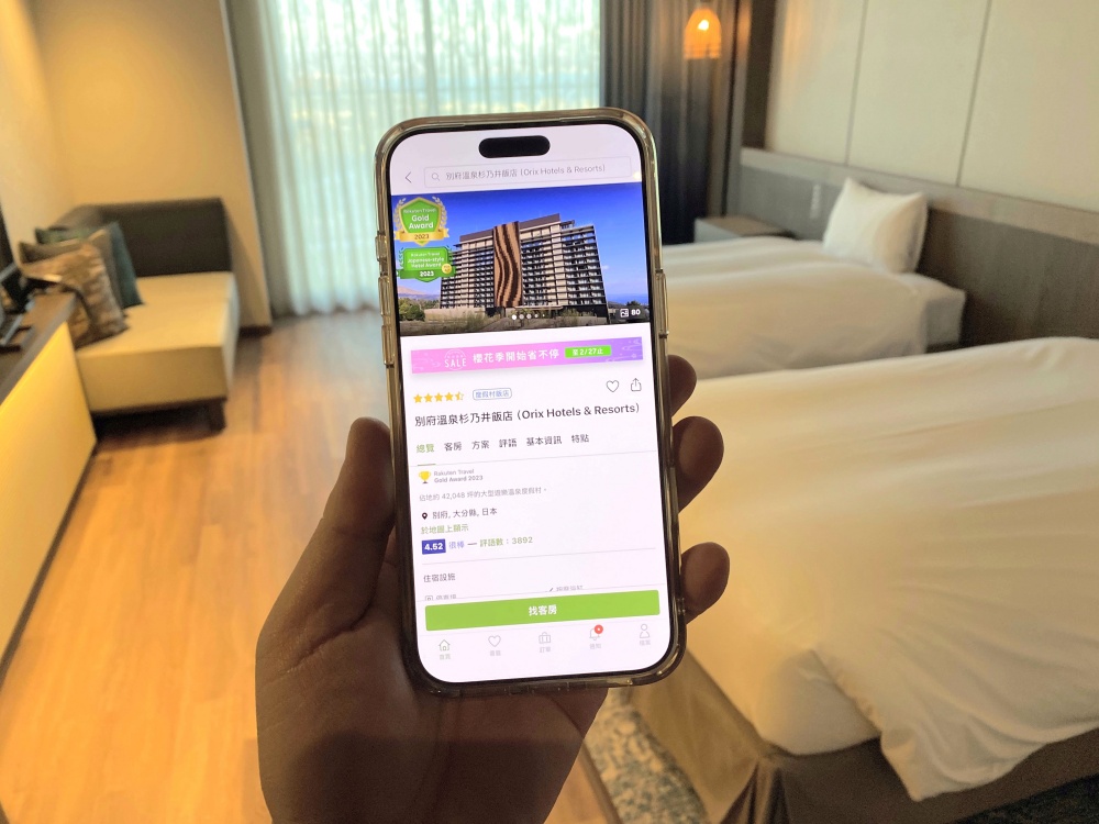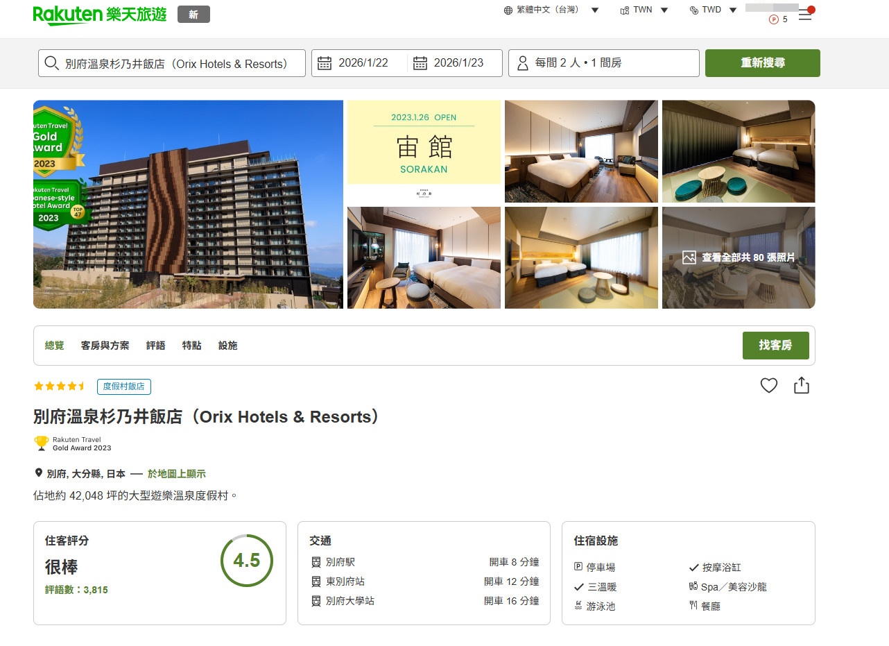 這次在別府入住的飯店是選擇「別府溫泉杉乃井飯店(Orix Hotels & Resorts)」,我就是在「Rakuten 樂天旅遊」中文版的訂房平台上面預約:別府溫泉杉乃井飯店