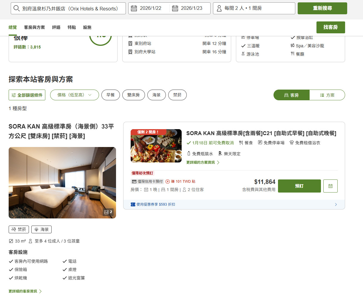 點擊進入「查看客房與方案」,即可看到現有房型選擇。像是我看到這間是在SORA KAN(宙館)的海景側房型,包含著自助早餐跟晚餐,剛好符合我的需求,而且這邊還會顯示使用優惠券的折扣、完成住宿後預計將獲得的點數!整體操作介面真的是一目了然!