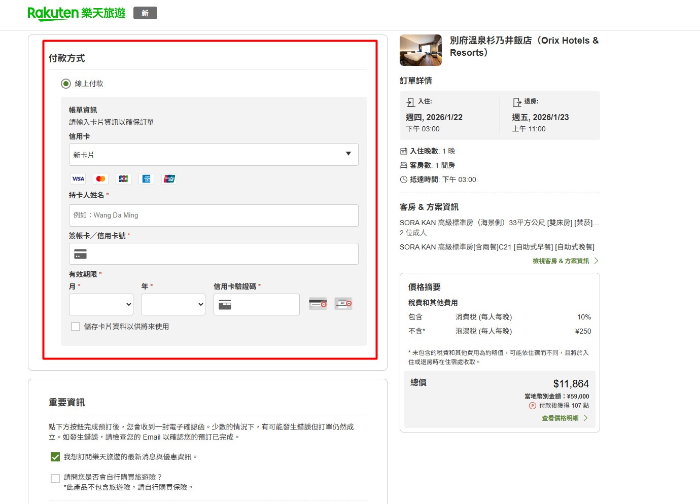 最後輸入信用卡資料,即可完成付款與訂房。確認訂房之後,您的電子信箱也都會收到訂房確認信,日本第一訂房平台「Rakuten 樂天旅遊」的中文版網站,操作是不是一整個超簡單,日系訂房平台也令人更加安心呢!