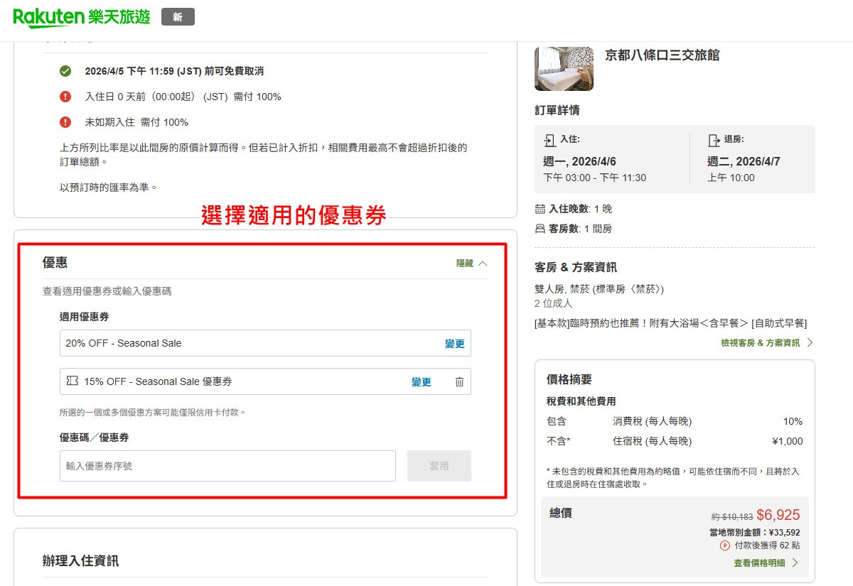 「Rakuten 樂天旅遊」最高四重優惠劵疊加使用
