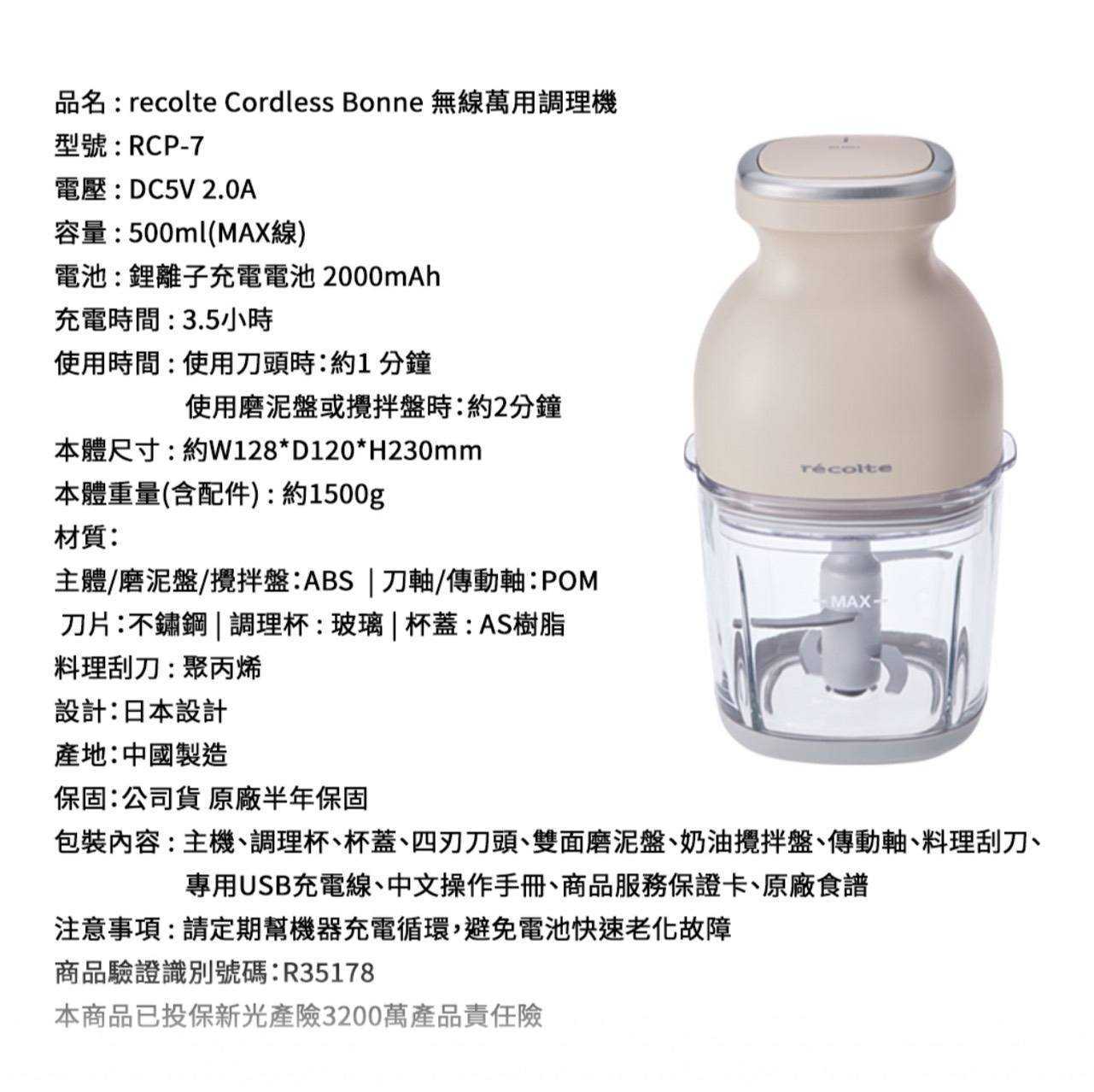 【recolte 麗克特】無線萬用調理機 RCP-7,台灣公司貨優惠開團